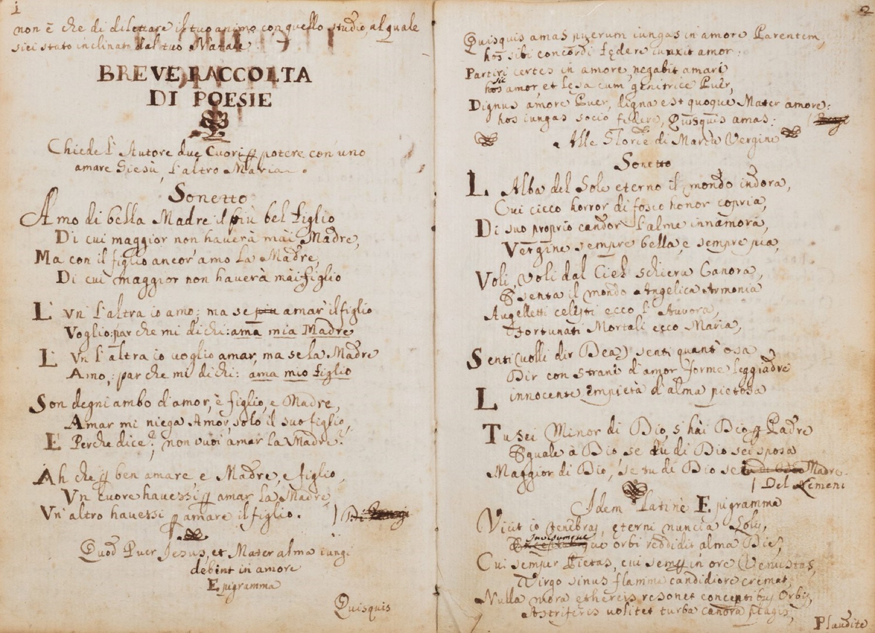Silloge di testi di natura religiosa, che si apre col Panegirico dell'Immacolata Concettione, per poi passare alla Selva per comporre prediche o Quaresimale, alle Lettere diverse di Giuseppe Brogi Distinto in diversi capi, ad una Raccolta di diverse Poesie dai metri diversi (sonetti, egloghe etc.). La seconda parte del codice si apre con un Proemio al Lettore dove ribadisce il valore pedagogico e dilettevole della poesia: "...in niuna altra arte l'animo più si solleva, e più si diletta che nella Poesia". Seguono 57 pagine di poesie, perlopiù sonetti, non solo di argomento religioso.