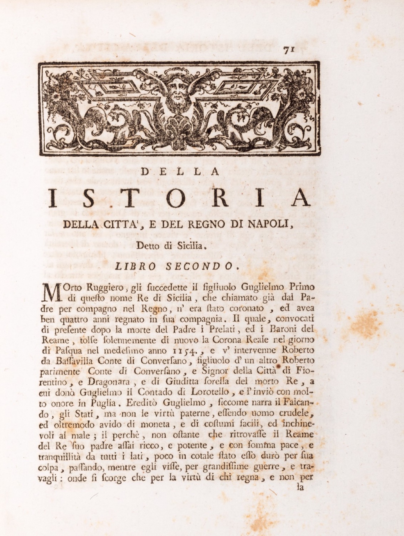 Napoli, Giovanni Gravier, 1769. In 4°. 2 voll. Fregio inciso sui frontespizi, piccole macchie alle prime carte del I vol., fioriture sparse, leggera brunitura marginale. II vol. legato con Origine della Citta' e delle famiglie nobili di Napoli, Napoli, Giovanni Gravier, 1769, legatura coeva in pergamena con titolo, autore e numero di tomo impressi in oro entro tasselli, lievi difetti.