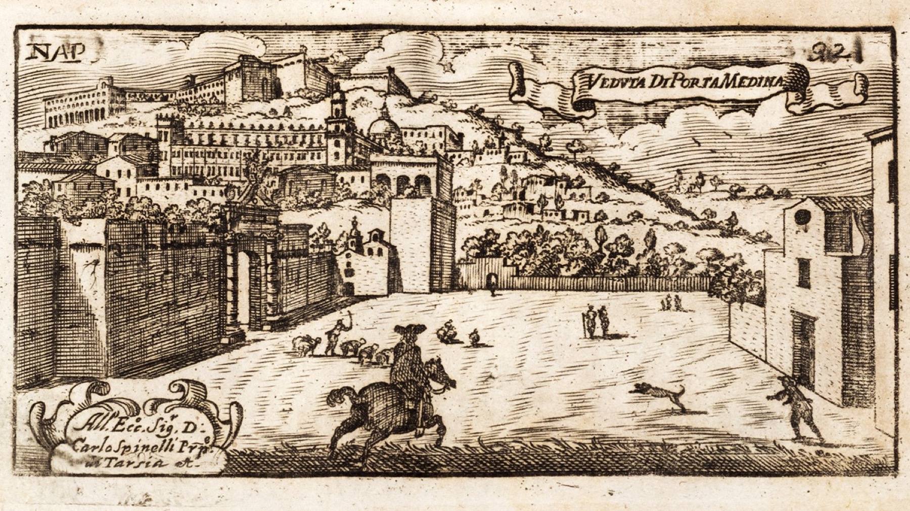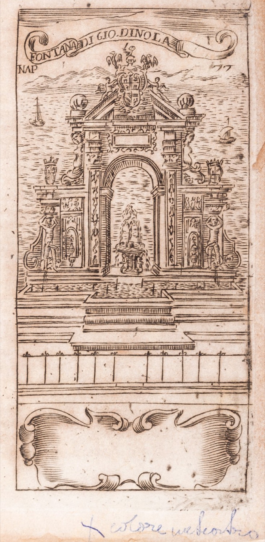 Napoli, Giuseppe Buono, 1751. In 16°. Antiporta incisa in legno, con 39 tavole (di 41, mancanti le tavole di pag. 78 "Veduta della Fontana Fonzeca" e 243 "Veduta dell'Annunziata"), tavola di pag. 80 "Veduta della Fontana di Gio: di Nola" staccata e con annotazione in inchiostro al margine bianco, leggera brunitura, lievi fioriture, legatura coeva in mezza pergamena, autore, titolo e anno in oro entro tasselli al dorso liscio, lievi difetti.
