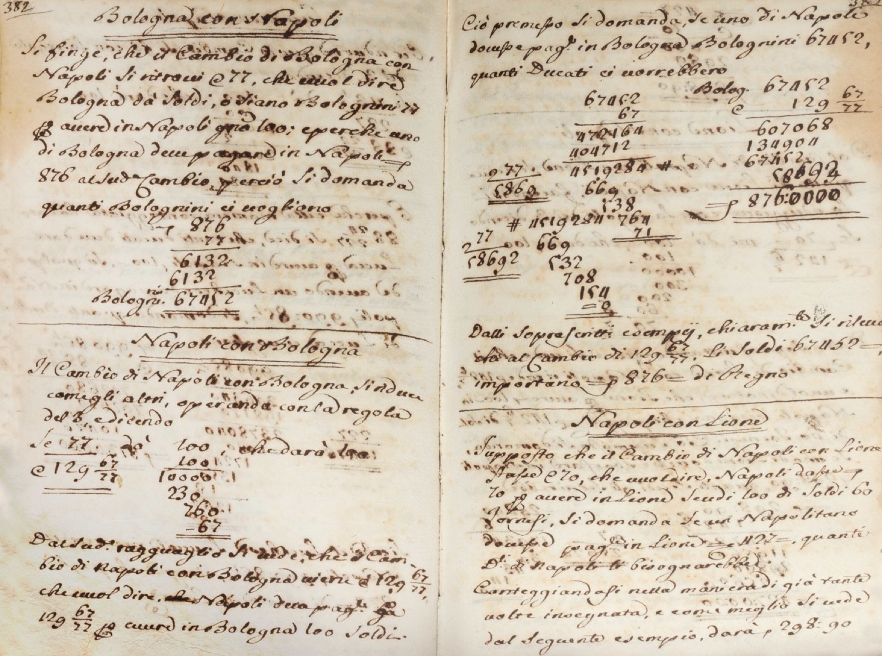 Manoscritto cartaceo di 110 pp. (numerate 295-405), metà sec.XVIII, diviso in due sezioni: Ragguaglio di Pesi e Misure e Trattato de' Conti, calcoli, operazioni matematiche, liste, problemi, legatura in cartoncino spugnato blu ottocentesco.