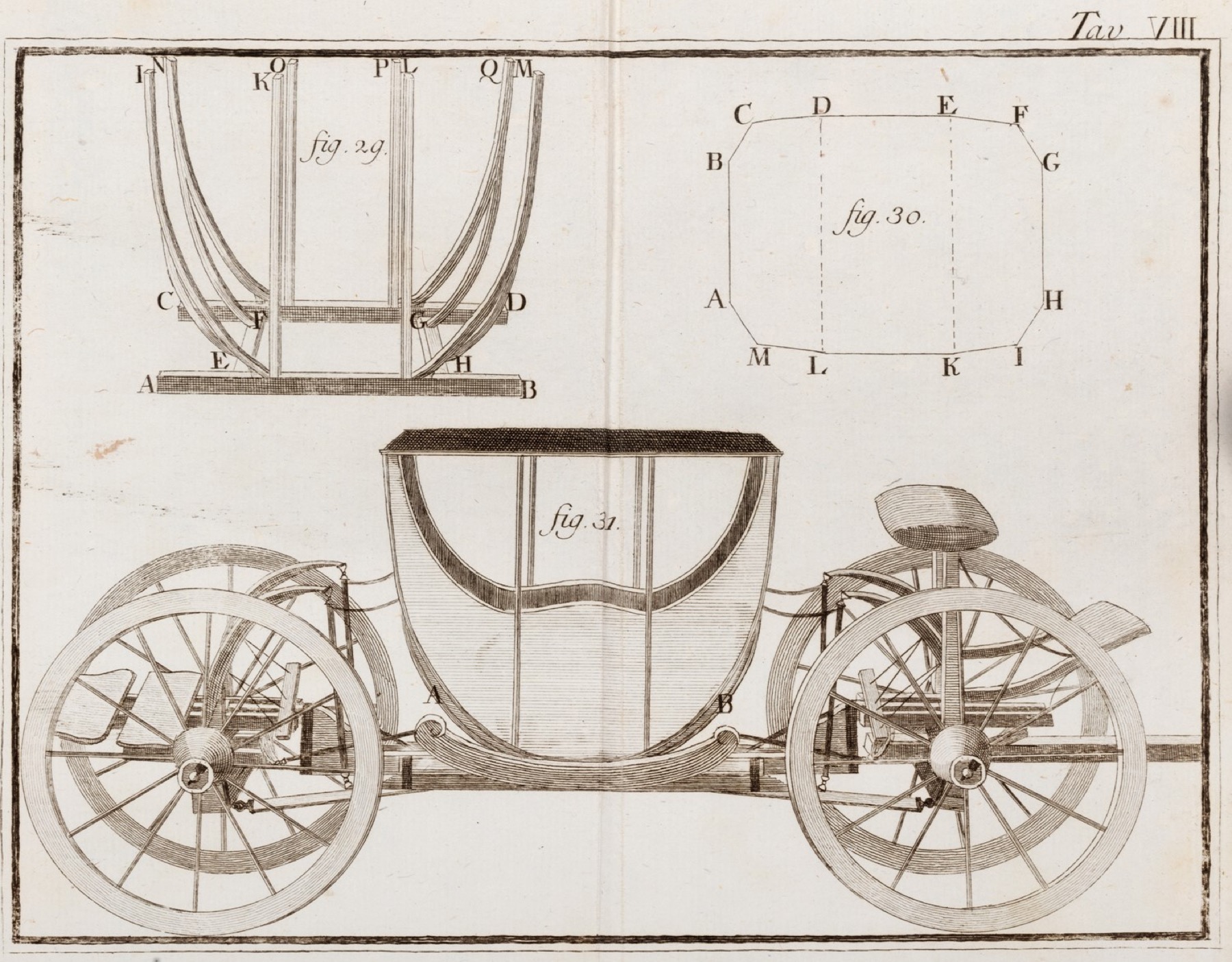 Treviso, a spese dell'autore [Giulio Trento], 1785. In 8°. Vignetta calcografica al frontespizio che raffigura una carrozza, con 9 carte di tavole calcografiche ripiegate fuori testo, sporadiche arrossature, poche lievi e marginali fioriture, piccolo strappo al margine bianco superiore di B3 che non interessa il testo, legatura in mezza pelle, autore e titolo impressi in oro entro tassello verde al dorso, qualche lieve abrasione.