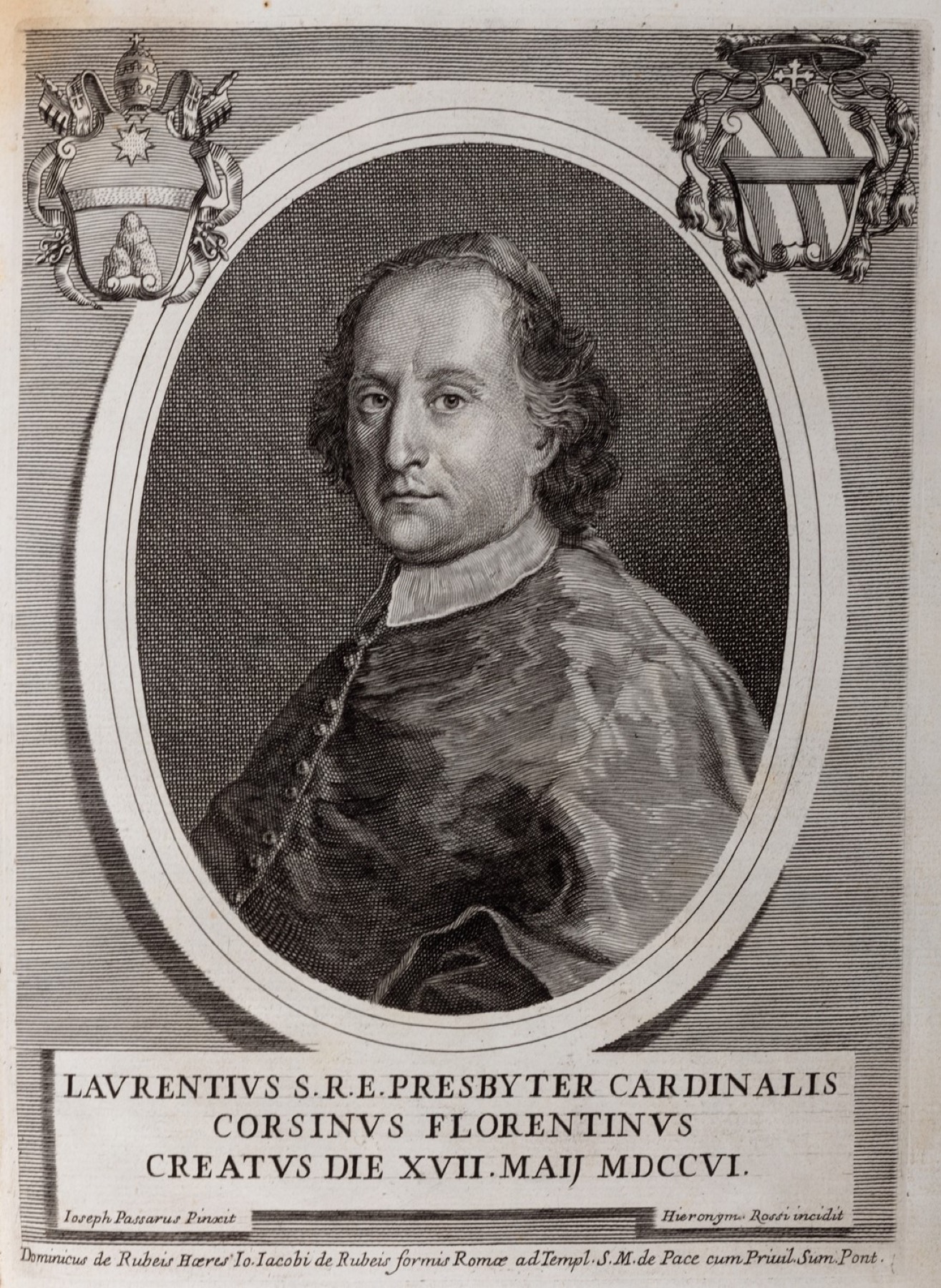 Roma, Alosio e Francesco e conti, 1706. In 4°. Elegante antiporta con il ritratto calcografico del dedicatario dell'opera, cardinale Lorenzo Corsini, basato sul disegno di Joseph  Passarus, frontespizio stampato in rosso e nero, testata figurata, aloni di umido, strappo risarcito a p. 319, legatura originale in pergamena, al dorso autore e titolo in oro, mancanze e leggere macchia.  Ex libris di mano antica al frontespizio.
