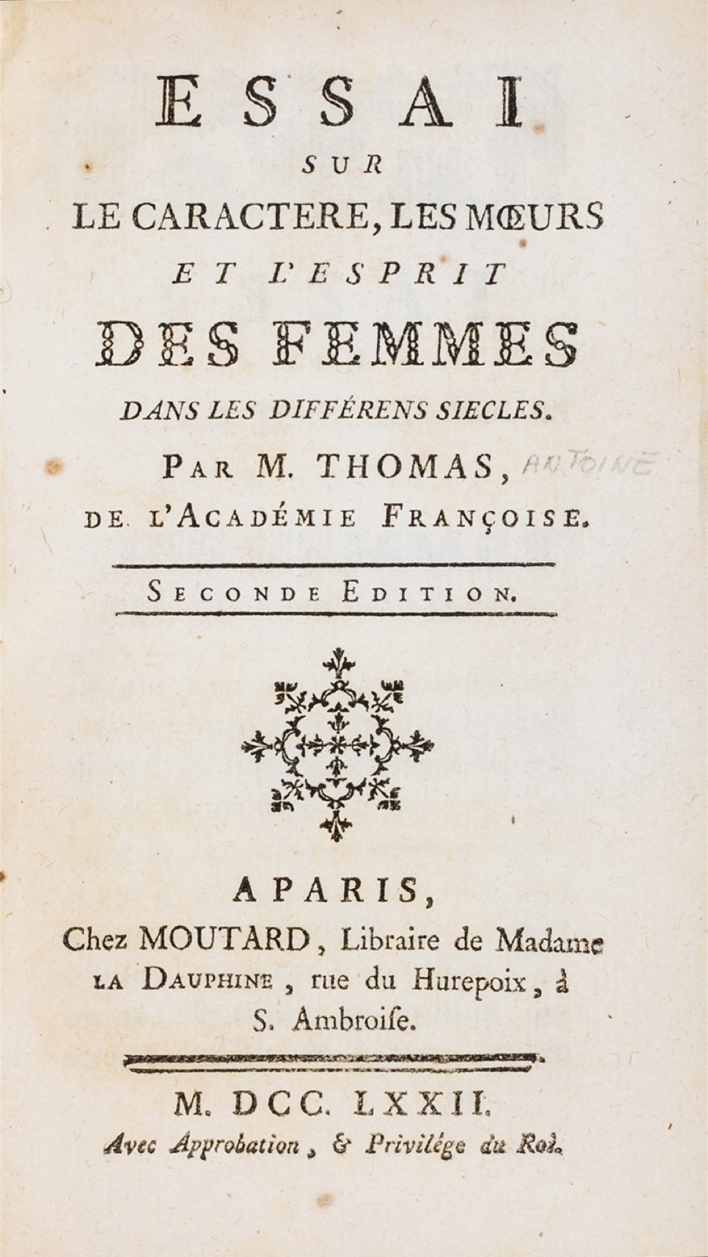 Amsterdam e Parigi, Moutard, 1773. 4 voll. In 12°. Fregio xilografico ai frontespizi, fioriture. Legato con: Essai sur le caractere, les moeurs et l'esprit des femmes dans les differens siecles. Stessi dati tipografici, 1772. Legatura coeva in pelle screziata, dorso liscio impresso in oro, tagli rossi, difetti alle cerniere, l'ultimo volume con macchie di umidità. Ex libris cartaceo al contropiatto: a Filippo Ferrero della Marmora.