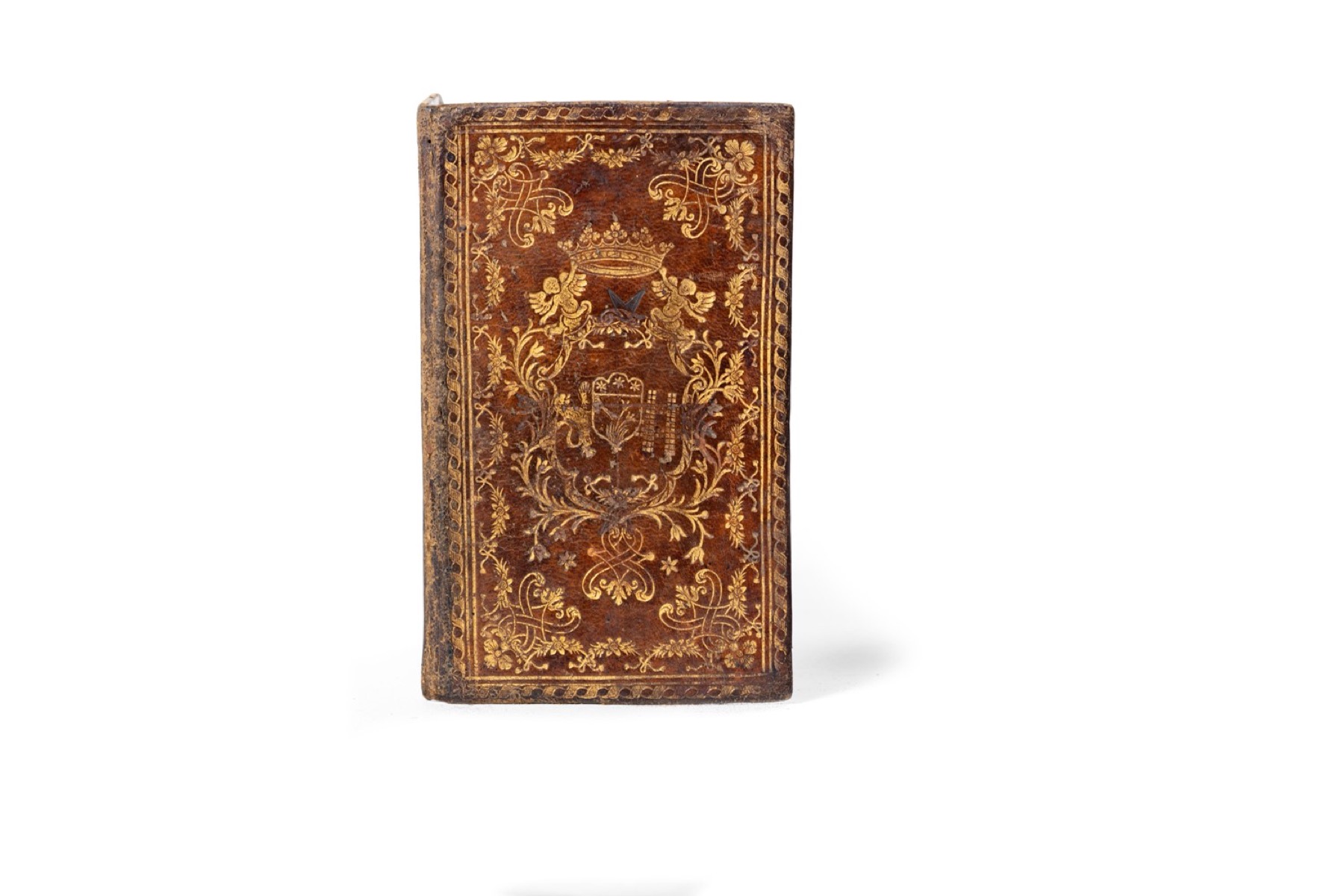Legatura vuota in 8°, in marocchino marrone, piatti completamente decorati in oro con ferri di fiori e foglie e volute curvilinee, al centro del campo le armi delle famiglia Braschi e Falconieri sormontate da corona sorretta da angeli, lievi difetti.
