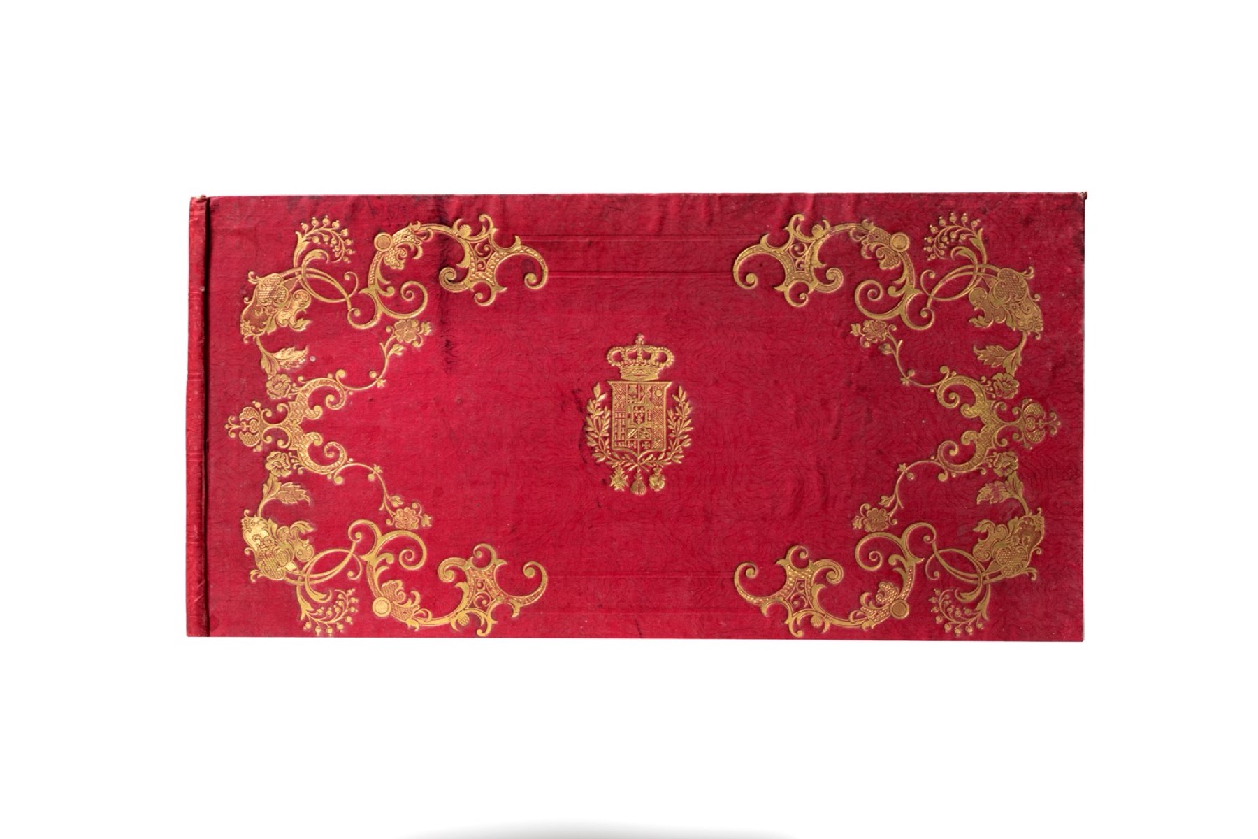 Legatura vuota in 8° oblungo in tela rossa con decorazione impressa in oro, cornici con volute di fiori, foglie, e reticolati, al centro del piatto anteriore le armi dei Borboni sormontate da corona, leggere macchie.