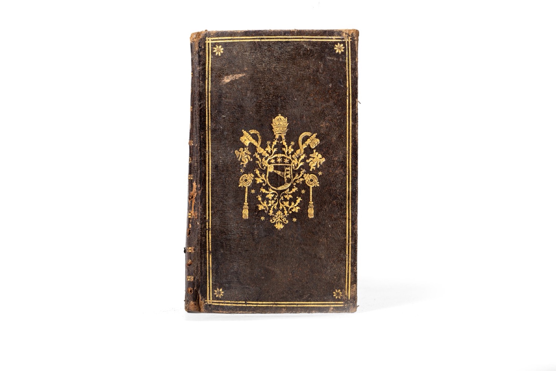 Legatura in 8°, in pelle marrone con decorazione impressa in oro, piatti inquadrati da cornice di duplice filetto, agli angoli interni ferro a fiore, al centro le armi papali di di Pio VI (al secolo Giovanni Angelico Braschi), sciupata, piccole lacune al dorso, sormontate dalla tiara e dalle chiavi.