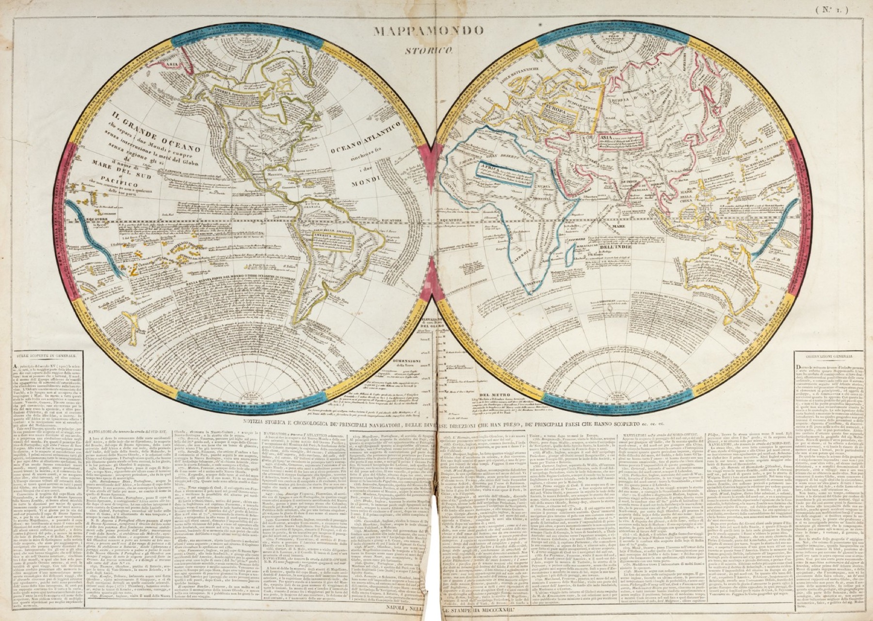 Napoli, Stamperia Reale, 1826. In 2°. Frontespizio con grande vignetta litografica, 2 pagine non numerate di prefazione, 40 tavole numerate a doppia pagina fuori testo, di cui la prima raffigura un grande mappamondo storico inciso e colorato all'acquerello d'epoca, nelle altre carte 18 rappresentazioni geografiche, incise ed acquerellate, primo fascicolo staccato, alla tavola 1 rinforzo e strappo alla parte inferiore della pagina sinistra, strappo alla tavola 9 senza perdita e rinforzi al verso, strappo lungo la piegatura centrale delle tavole 10,11, 12 di diversa entità, alla tavola 19 macchia, rinforzi e aloni di umidità, qualche macchia alle ultime carte, legatura coeva in mezza pelle, molto rovinata.