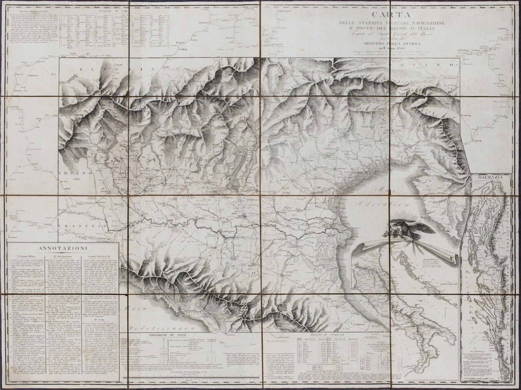 Cartografia Napoleonica - Carta delle stazioni militari, navigazione e poste del Regno d'Italia eseguita nel Deposito generale della Guerra per ordine del ministero della guerra nell'anno 1808. Coll'aggiunta delle Poste e delle Stazioni Militari conducenti agli Stati Limitrofi