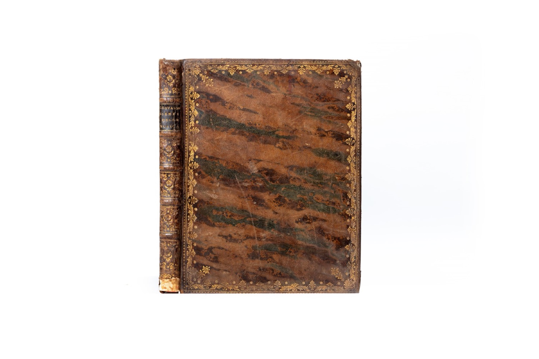 Volume manoscritto di 95 carte numerate più due sguardie iniziali e finali, 223 x 174 mm., ogni pagina recante al recto - entro una cornice a doppio filetto - pentagrammi e note relativi all'argomento trattato, piccolo strappo all'angolo inferiore della I carta, legatura coeva in vitello spugnato con decorazioni ai piatti e al dorso, tagli rossi.