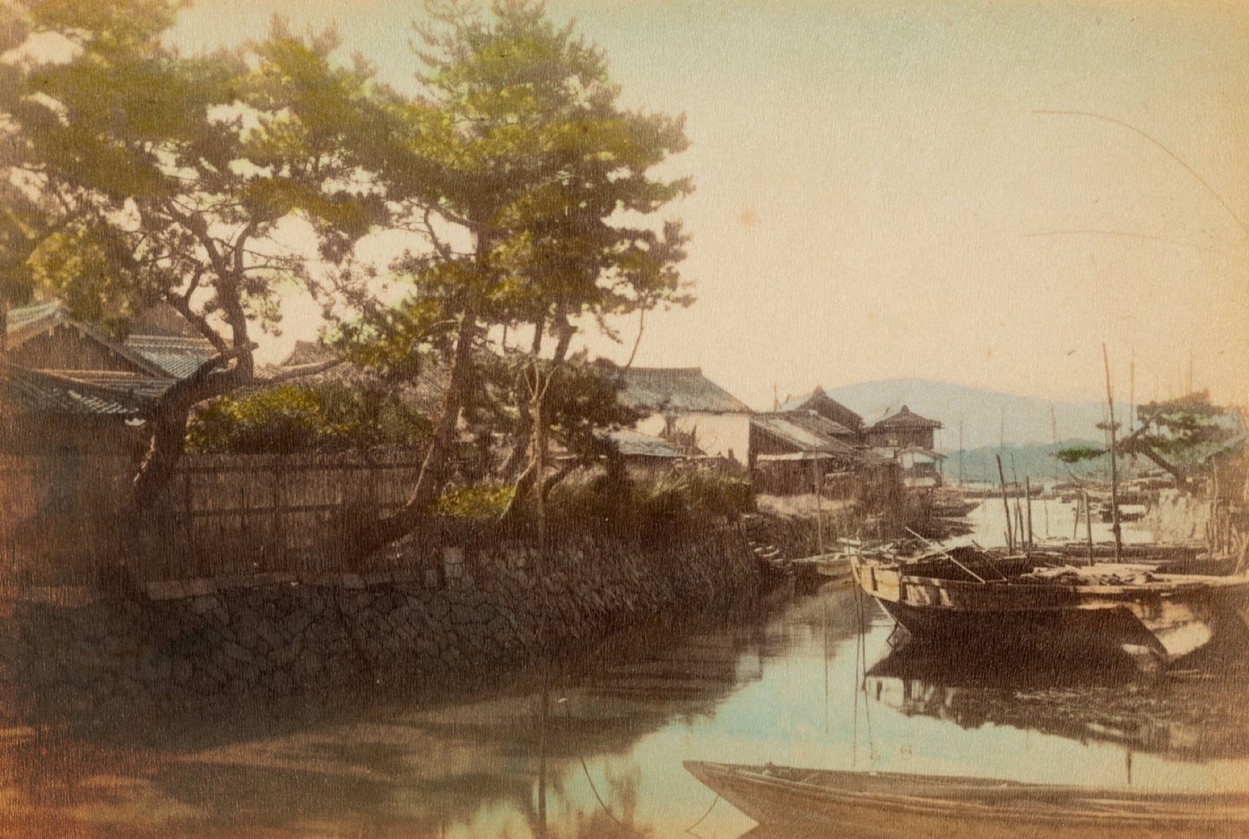 Album a fisarmonica [sec. XIX] (mm. 197x150), con 48 stampe all’albumina (mm. 90x135), colorate a mano, montate recto-verso su cartoncino originale, molte recanti titoli in basso a destra e protette da veline, fioriture sporadiche e macchie leggere ai margini bianchi e su qualche fotografia, cartoncino a fisarmonica staccato in 2 parti, bella legatura in lacca bordeaux con decorazione di fiori in nero, rosso e marrone, al piatto anteriore due figure intarsiate con volti eseguiti a rilievo in madreperla, perdita di lacca agli angoli, piatti, staccati. piatti staccati.