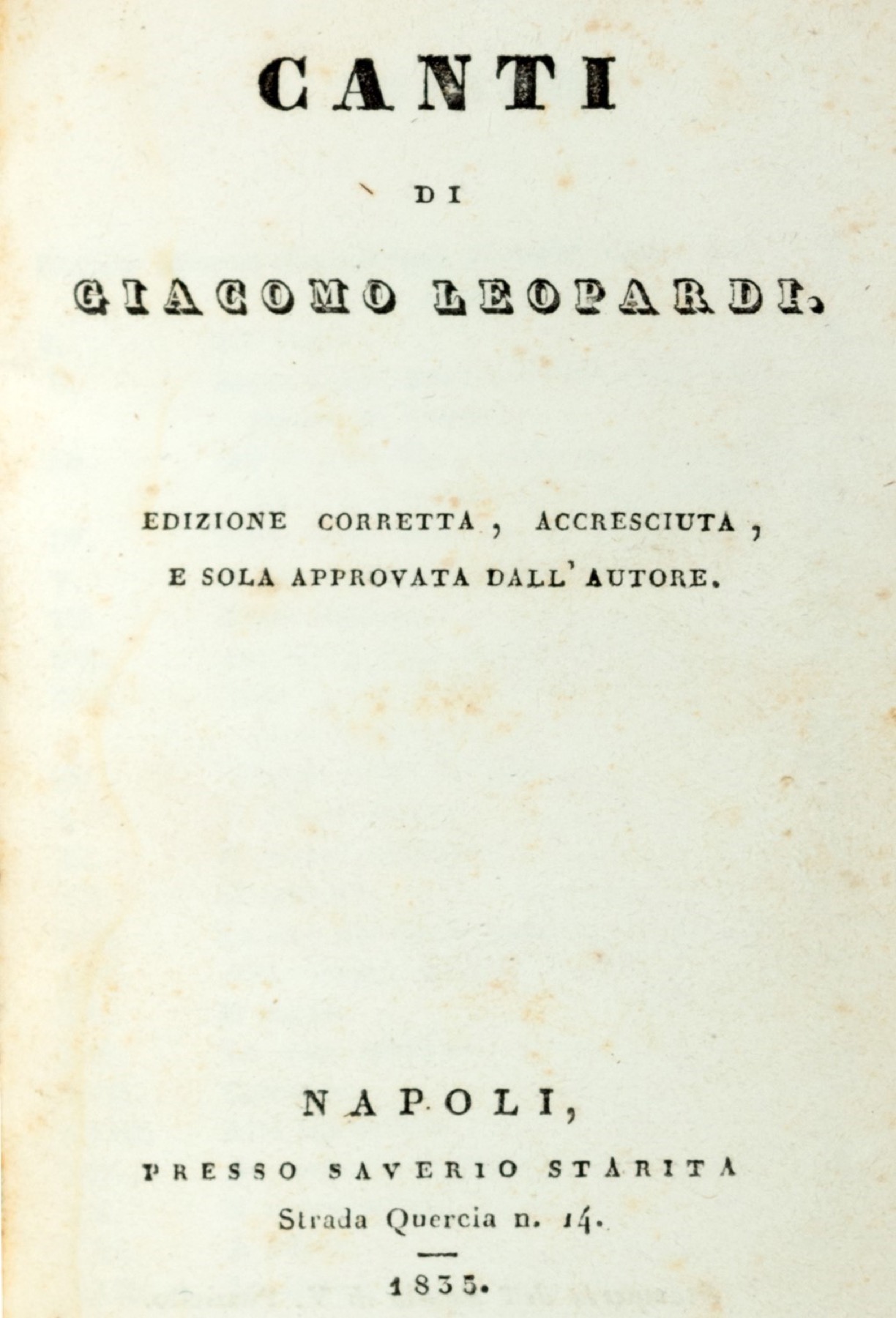 Rara edizione corretta, accresciuta e sola approvata dall'autore. L'edizione subì l'intervento della censura borbonica: dei 6 volumi previsti dal libraio Saverio Starita, vennero stampati solo i Canti e le Operette. “La mia filosofia è dispiaciuta ai preti, i quali e qui ed in tutto il mondo, sotto un nome o sotto un altro, possono ancora e potranno eternamente tutto”, scriveva Leopardi al Sinner il 22 dicembre del 1836.