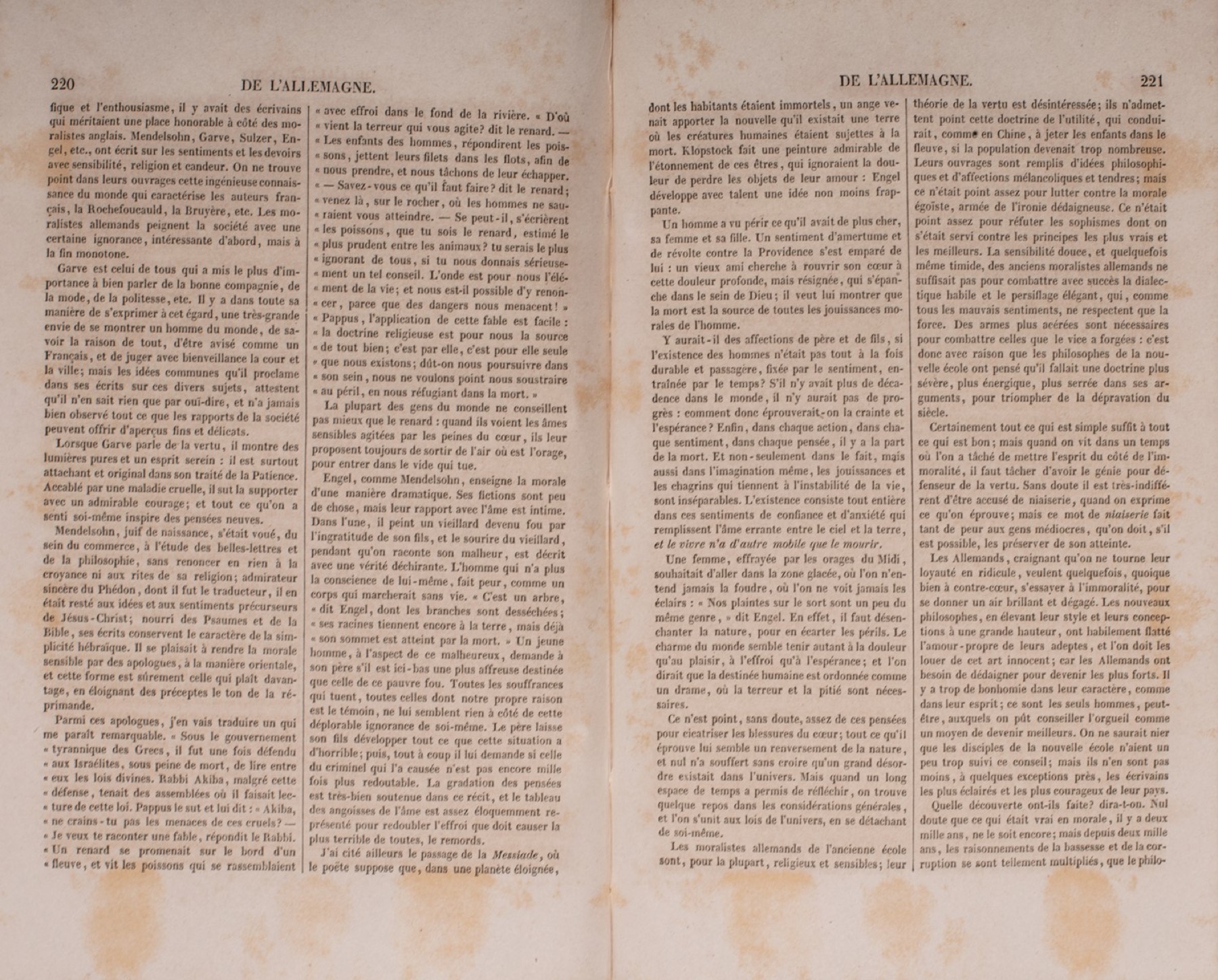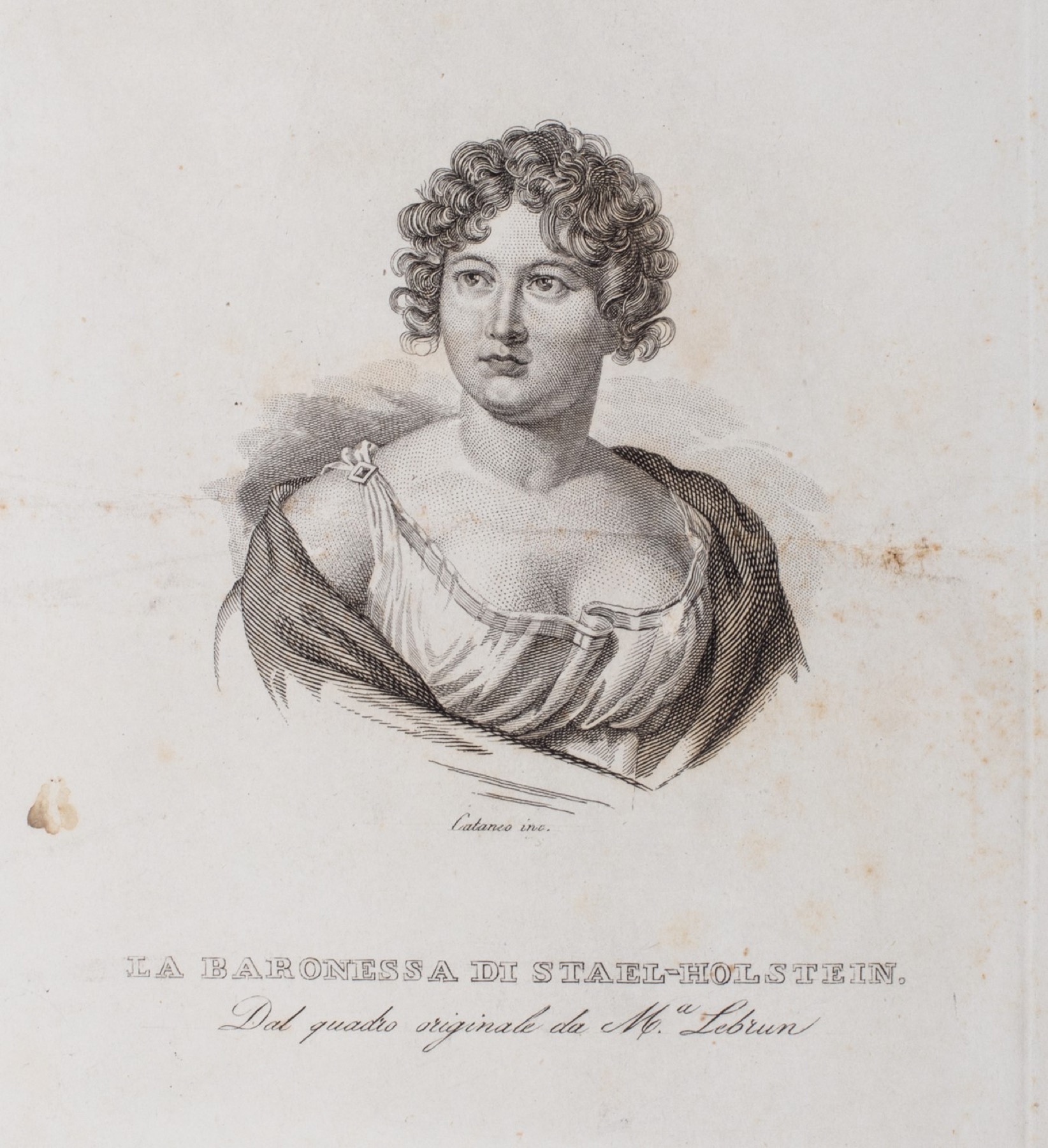 Parigi, Firmin Didot, Treuttel et Wurtz, 1838. In 8°. 2 voll. Vignetta calcografica ai frontespizi, ritratto calcografico dell'autrice inciso da Cataneo, tavola staccata, leggera brunitura, arrossature e fioriture sparse, legatura coeva in mezzo marocchino verde, difetti. § Insieme nel lotto della stessa autrice Oeuvres posthumes de Madame la baronne De Stael-Holstein : precedees d'une notice sur son caractere et ses ecrits, Parigi, Firmin Didot, Treuttel et Wurtz, 1838. In 8°. Firme di appartenenza al verso del frontespizio del I volume e dell'occhietto dell'ultima opera.