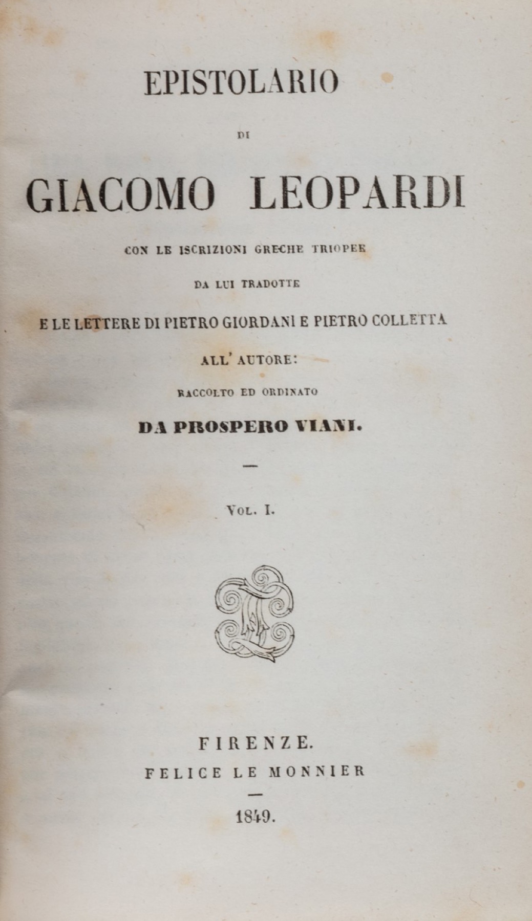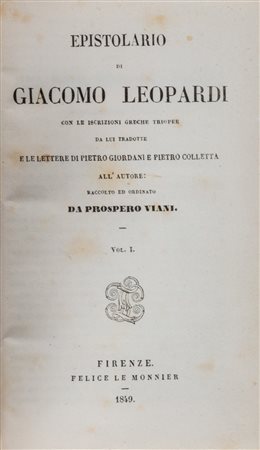 Letteratura italiana / Leopardi, Giacomo - Epistolario con le inscrizioni greche triopee da lui tradotte e le lettere di Pietro Giordani e Pietro Colletta all'autore: raccolto e ordinato da Prospero Viani