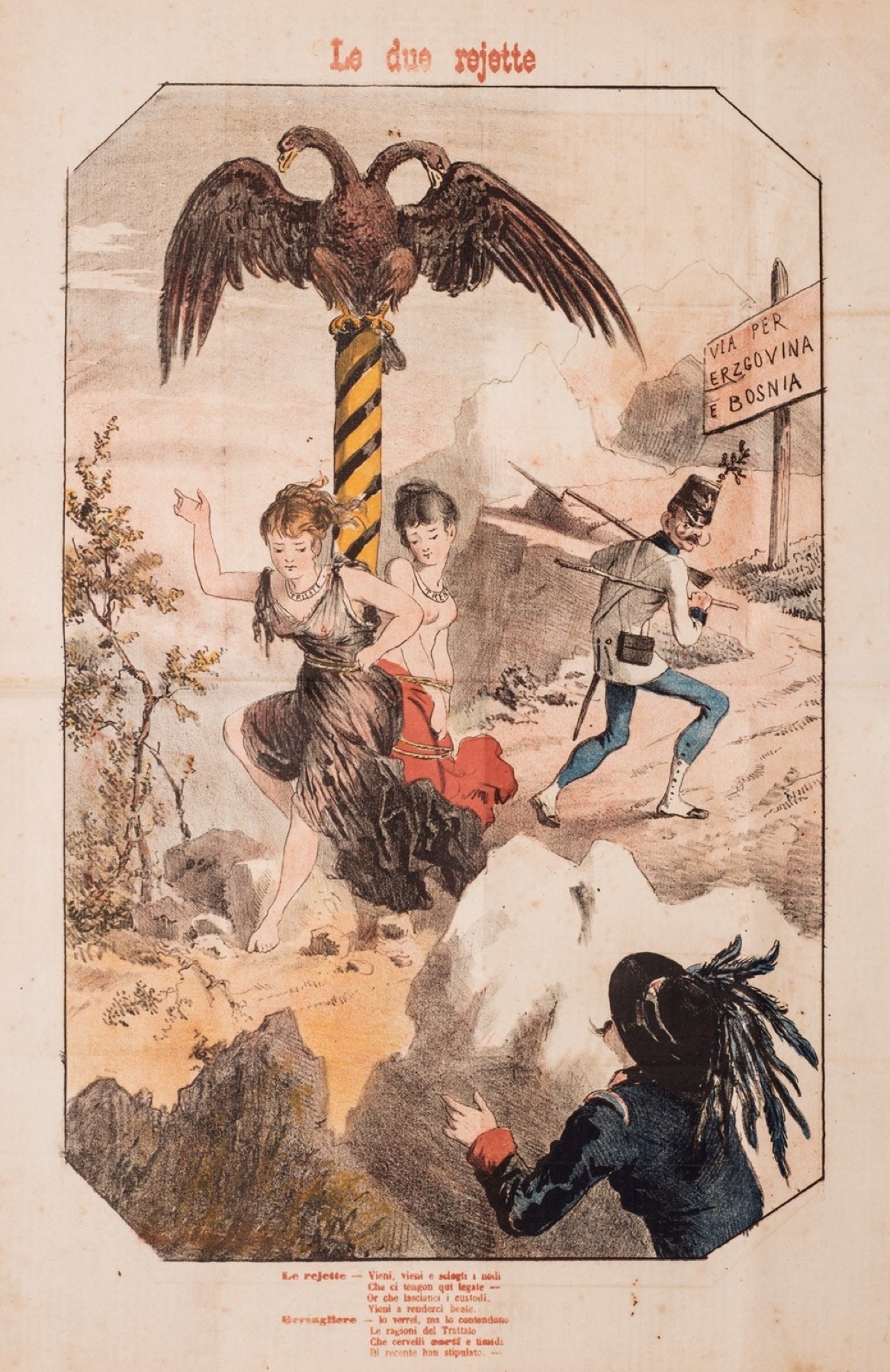 Roma, Tipografia dei Fratelli Centenari, 2 gennaio 1878 - 29 dicembre 1978. In 2°. Anno VII, n.1- 152. Testate xilografiche con la figura della maschera senese "Don Pirloncino", e grandi illustrazioni a doppia pagina raffiguranti vignette satiriche o ritratti, molte a colori, qualche strappo, fioriture, legatura coeva in mezza pergamena con angoli, dorso liscio, con tassello, qualche mancanza al dorso.