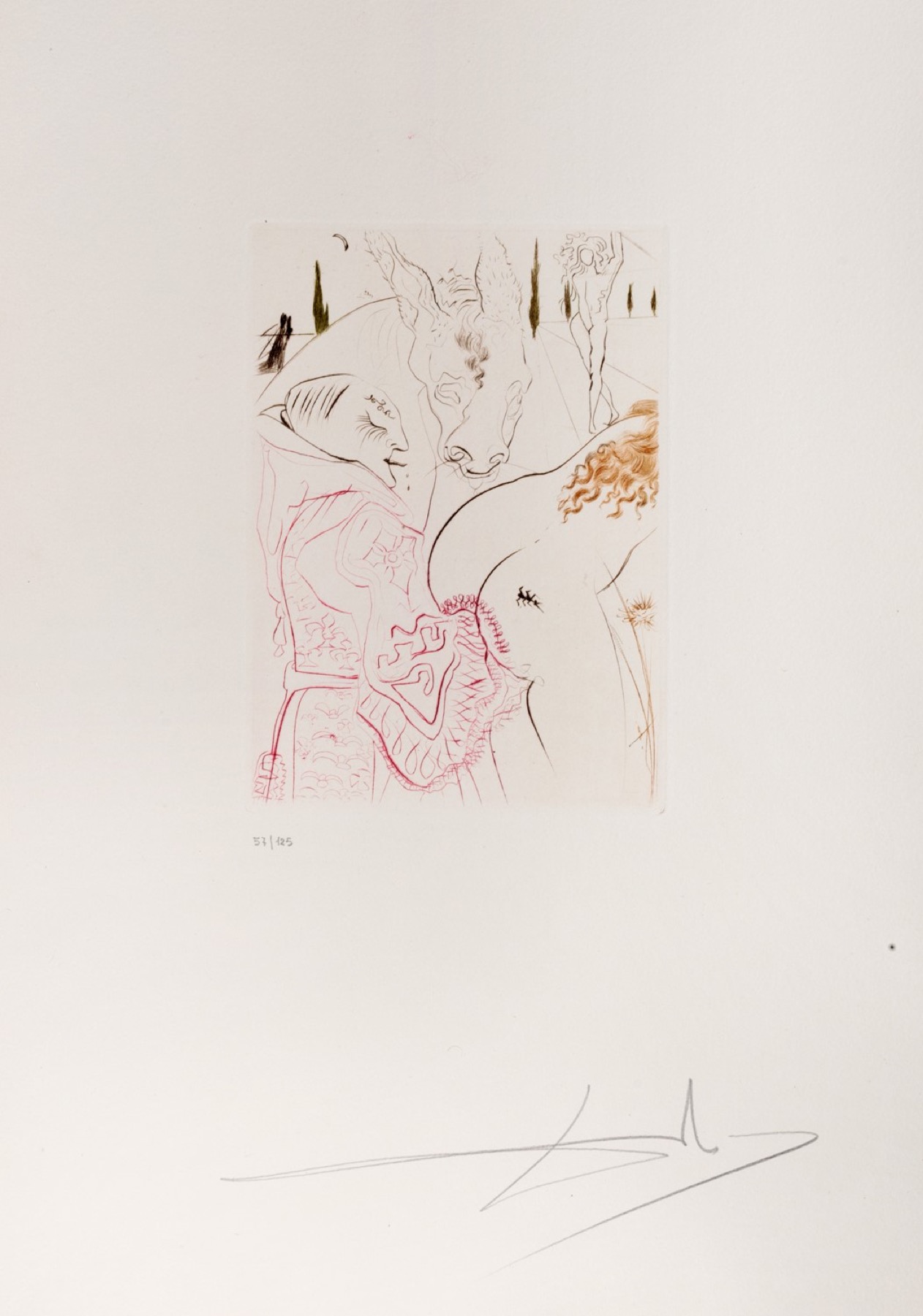 Parigi, Michele Broutta e Pamela Verlag, 1972. In 2°.  Con 10 tavole eseguite a punta secca e stampate a colori di Salvador Dalì, ciascuna numerata e firmata a matita dall'artista e protetta da foglio trasparente, testo a fogli sciolti, sporadiche lievi fioriture, camicia editoriale in cartoncino ed astuccio editoriale  in tela color rubino, lungo il dorso impressi in oro nome dell’artista e titolo.