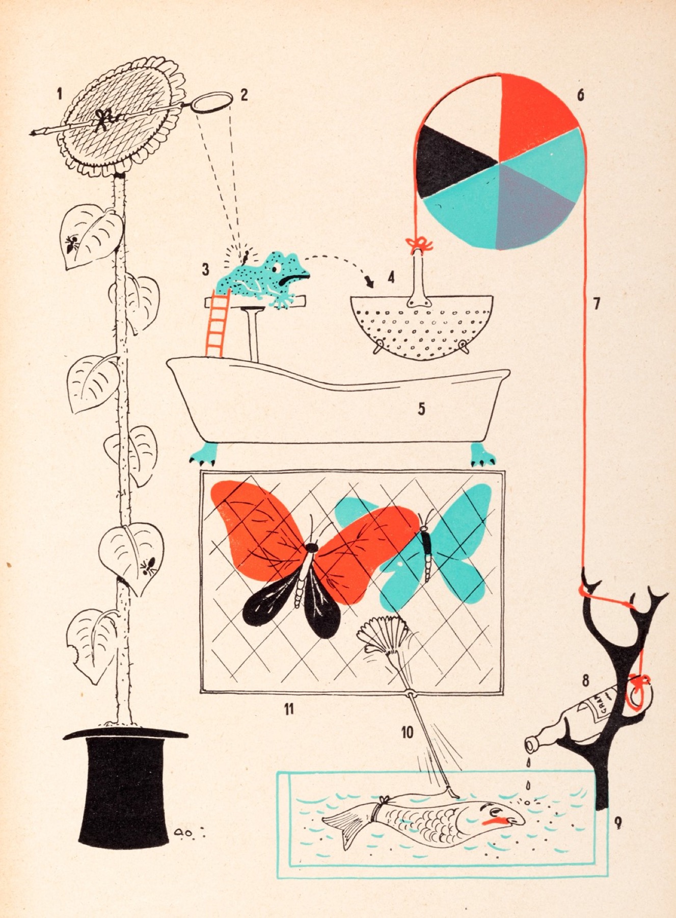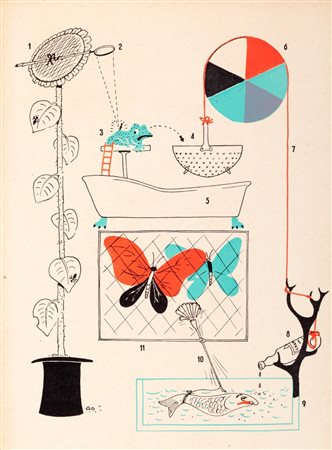 PRIMA EDIZIONE. L'opera, originalissima sia nella veste tipografica che nel contenuto, tratta di 13 singolari invenzioni, ciascuna descritta nei particolari "tecnici" e accompagnata da un'illustrazione. Tra i marchingegni più strani, il "Motore a lucertola per tartarughe stanche", il "Congegno a pioggia per rendere musicale il singhiozzo" e lo "Sventolatore di fazzoletti alla partenza dei treni". L'irriverente fantasia di Munari non risparmiava neanche il suo editore. Ecco cosa scriveva, in una lettera del 1942, ad Einaudi:"Se avete intenzione di 'lanciare' il libro, eccovi qualche suggerimento intonato al 'prodotto'; esempio: mettere nella vetrina del libraio un oggetto delle mie macchine (o un animale) con un cartellino che dica: questa lumaca e la zia della lumaca Maria che fa parte delle macchine per cuocere le uova. Oppure mettere un comignolo (di quelli di terracotta) con la scritta: dentro a questo camino abitava la tartaruga Catari che, dati i tempi, e andata a farsi motorizzare". Maffei 2002, p. 56.