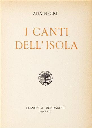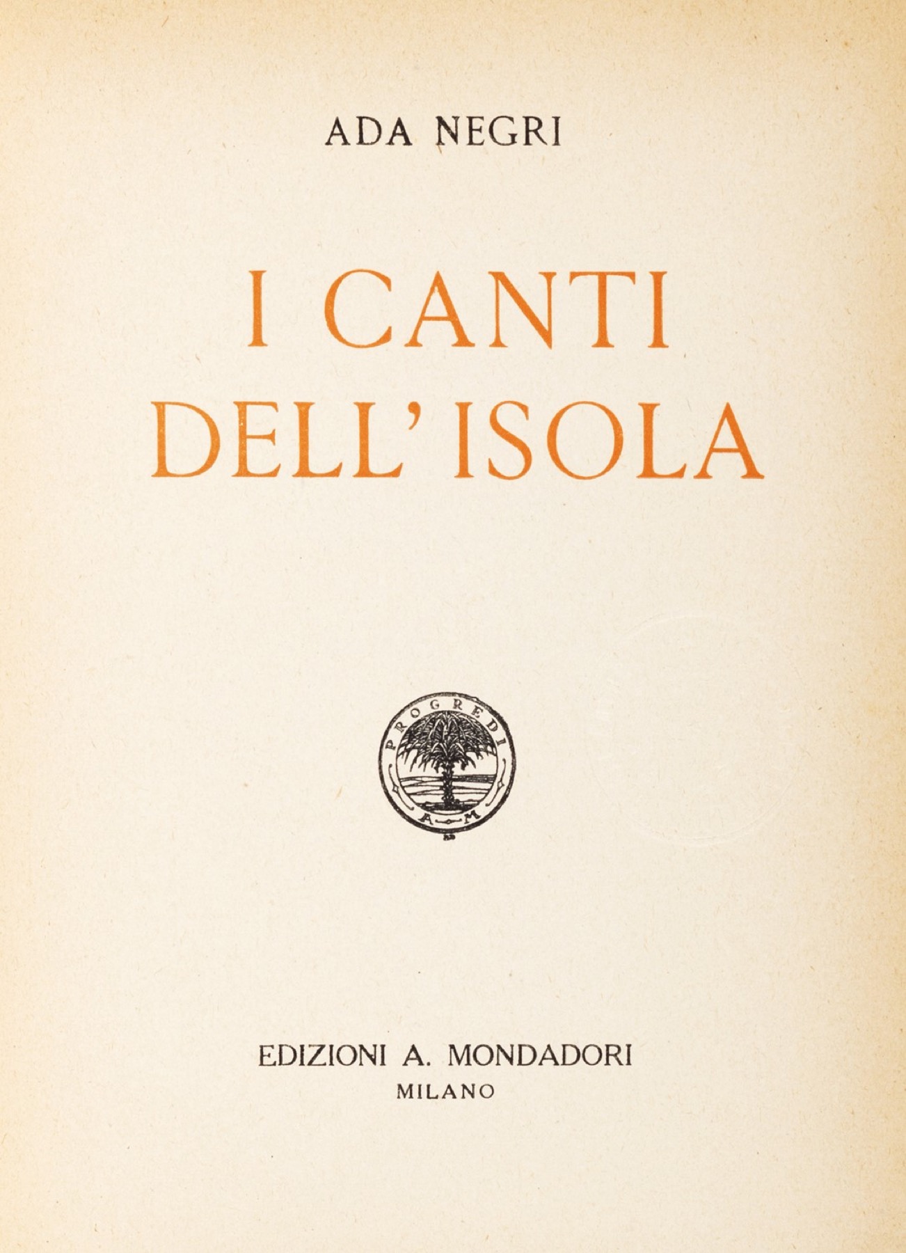 Milano, Mondadori, 1924. In 4°. Occhietto, frontespizio in inchiostro nero e rosso con marca tipografica, capilettera in rosso, fregi xilografici, leggera brunitura, piccolo strappo al margine inferiore di p. 87, brossura editoriale con titolo in rosso, autore e dati tipografici in nero, al dorso il titolo, gore d'acqua ai margini di entrambi i piatti, fioriture. Dedica autografa datata 8 dic. 1924.