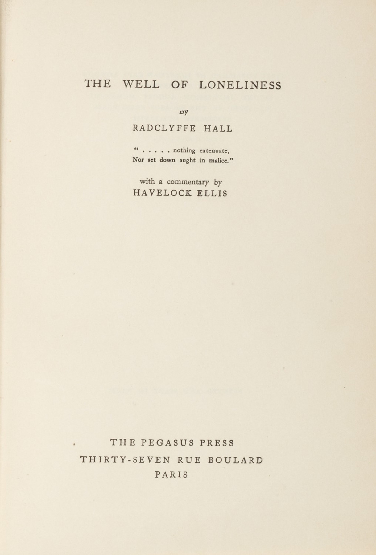 Prima edizione parigina in terza emissione. Romanzo miliare, considerato il primo ad affrontare una storia apertamente lesbica, The Well of Loneliness è l'opera più famosa della scrittrice britannica Marguerite Radclyffe Hall. Pubblicato per la prima volta nel 1928 a Londra da Jonathan Cape, subì la censura a seguito di una pressante campagna di demonizzazione condotta da James Douglas, direttore del Sunday Express. Cape pertanto decise di eludere la censura cedendo i diritti alla casa editrice parigina Pegasus Press e organizzando contestualmente la spedizione a Londra, presso il libraio Leopold Hill, dei libri dati alle stampe in Francia. L'escamotage non sfuggì al Ministero dell'Interno, che emise un mandato per sequestrare le spedizioni della terza emissione parigina, di cui fa parte l'esemplare offerto in asta.