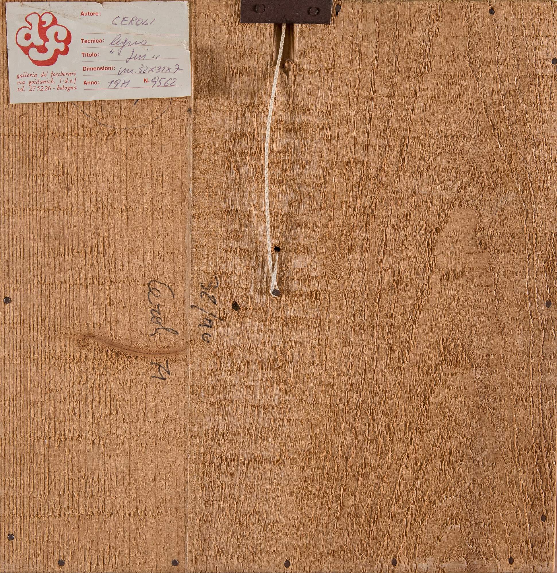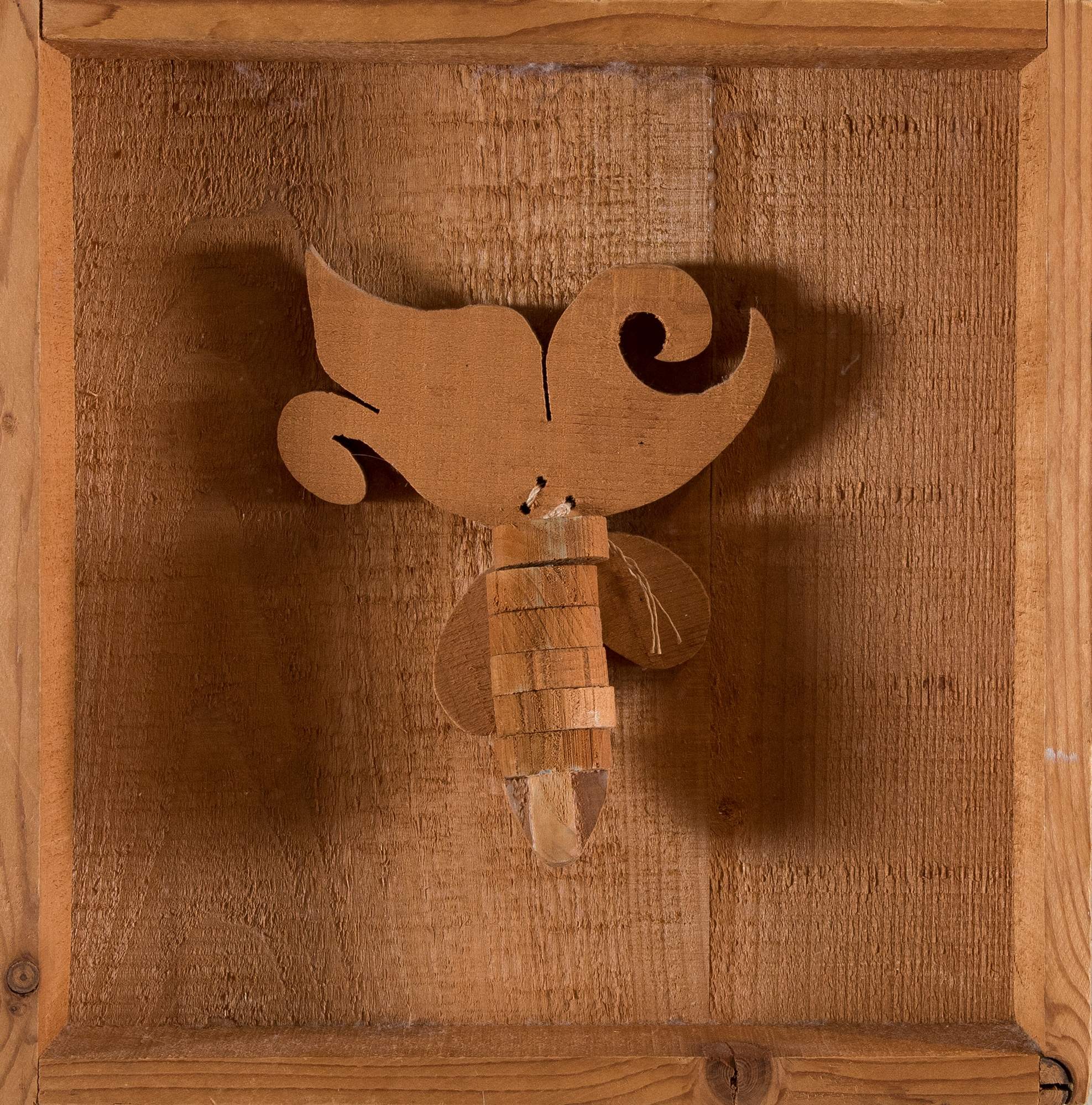 MARIO CEROLI (Castel Frentano 1938) "Lui", 1971. Scultura in legno e corda. Cm 32x31x7. Al retro reca numeri di tiratura, firma e data 32/90 Ceroli '71. Al retro reca etichetta della Galleria de' Foscherari, Bologna. Al retro reca probabile numero di archiviazione N9562.
