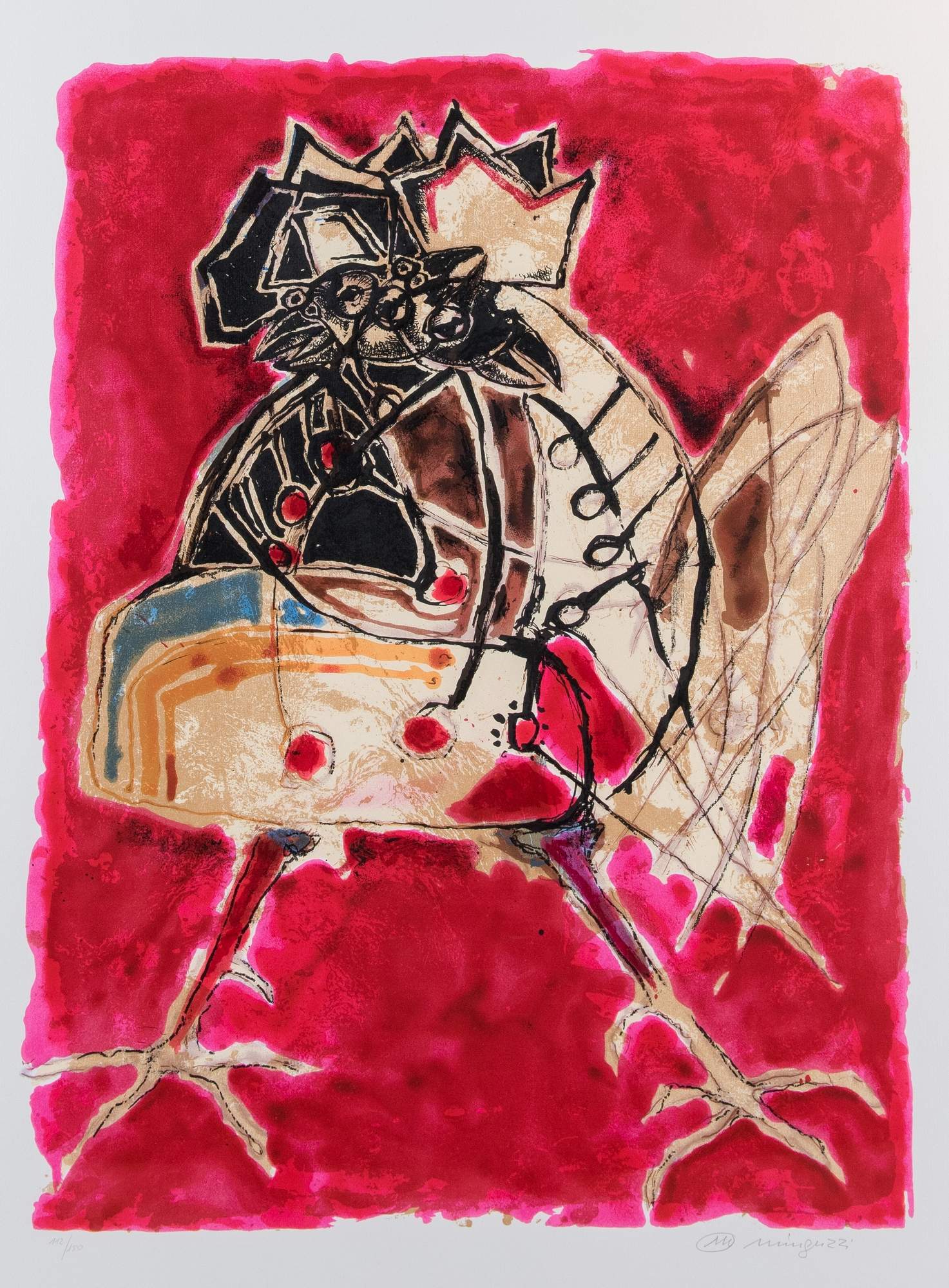 LUCIANO MINGUZZI (Bologna 1911 - Milano 2004) "Gallo". Litografia a colori su carta. Cm 89,5x69. Opera firmata in basso a destra Minguzzi. Reca numeri di tiratura in basso a sinistra 112/150. Al retro reca etichetta Galleria d'Arte La Loggia, Bologna.