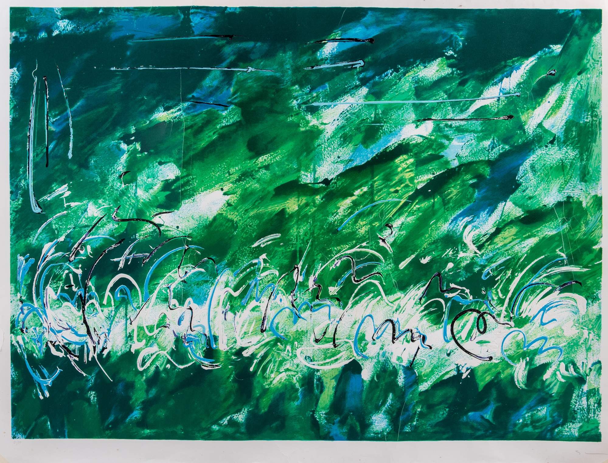 MARIO SCHIFANO (Homs 1934 - Roma 1998) "Orto botanico". Serigrafia materica su carta. Cm 130x170. Opera firmata in basso a destra Schifano. Reca in basso a sinistra numeri di tiratura 83/99. (Difetti).