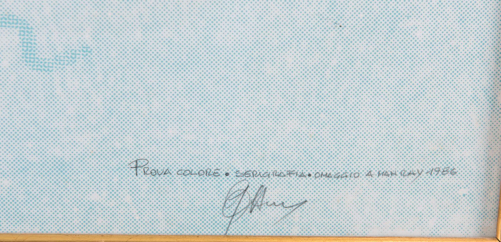 Anonimo del XX secolo. "Manturner (Omaggio a Man Ray)", 1986. Serigrafia a colori su carta. Cm 87x69,5. Opera firmata in basso a Ottavio Gigliotti.