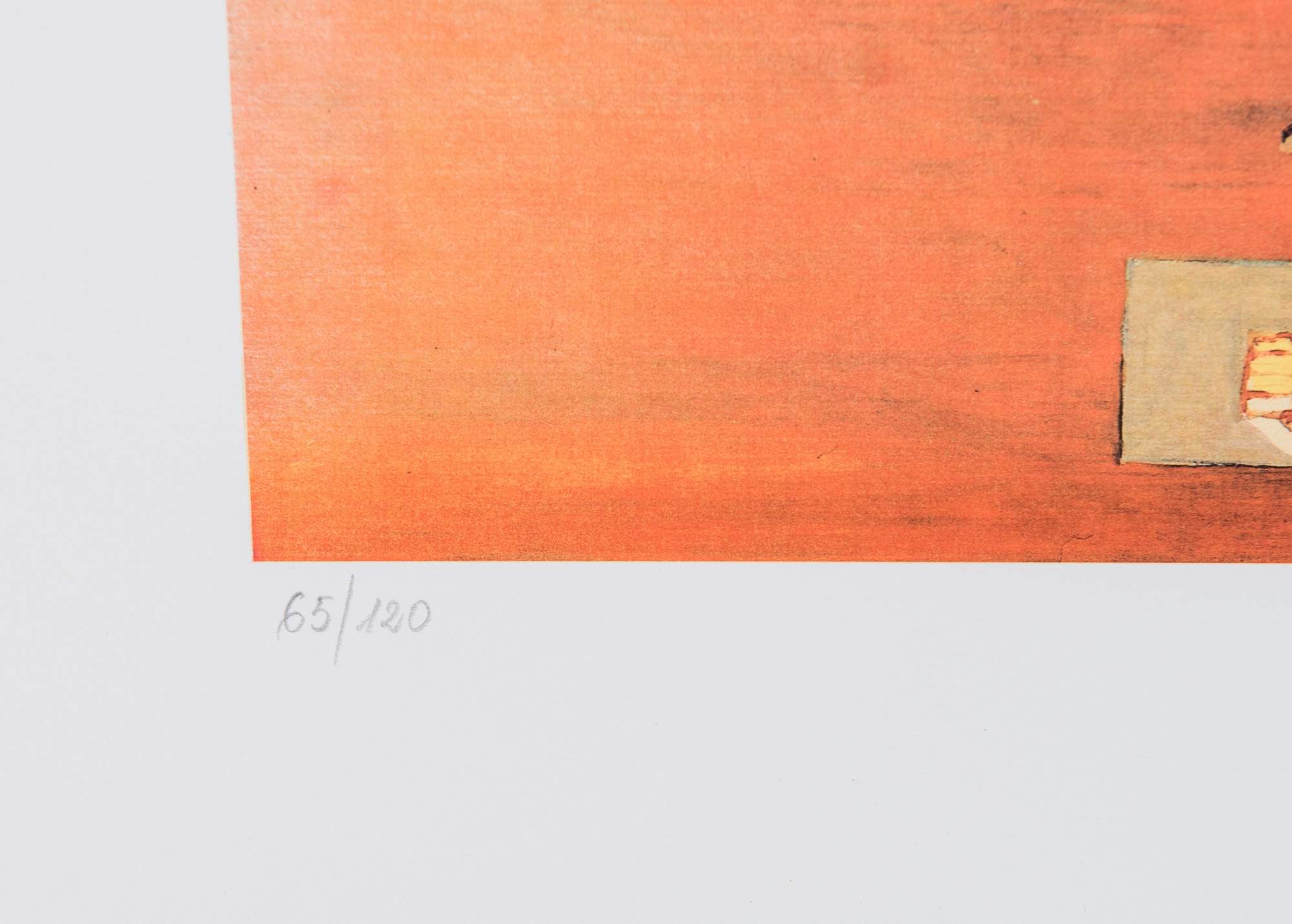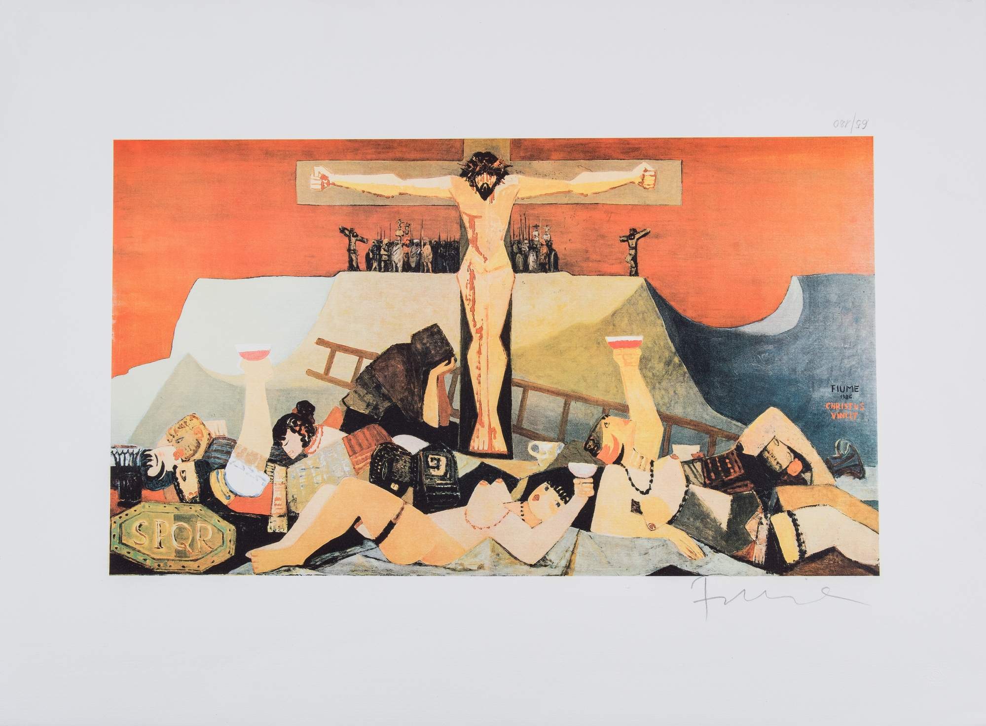 SALVATORE FIUME (Comiso 1915 - Milano 1997) "Crocifissione". Litografia a colori su carta. Cm 60x80. Opera firmata in basso a destra Fiume. Reca numeri di tiratura 65/120. In basso a destra e in alto a destra reca timbri Salvatore Fiume.
