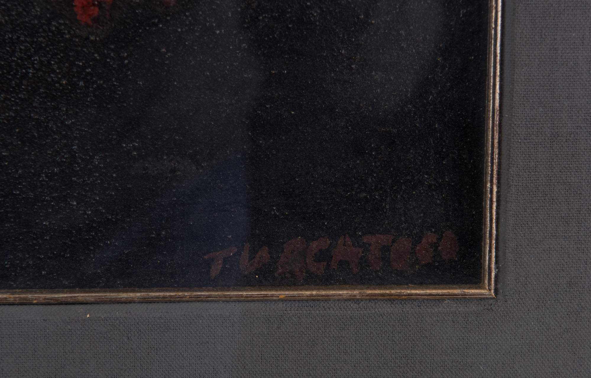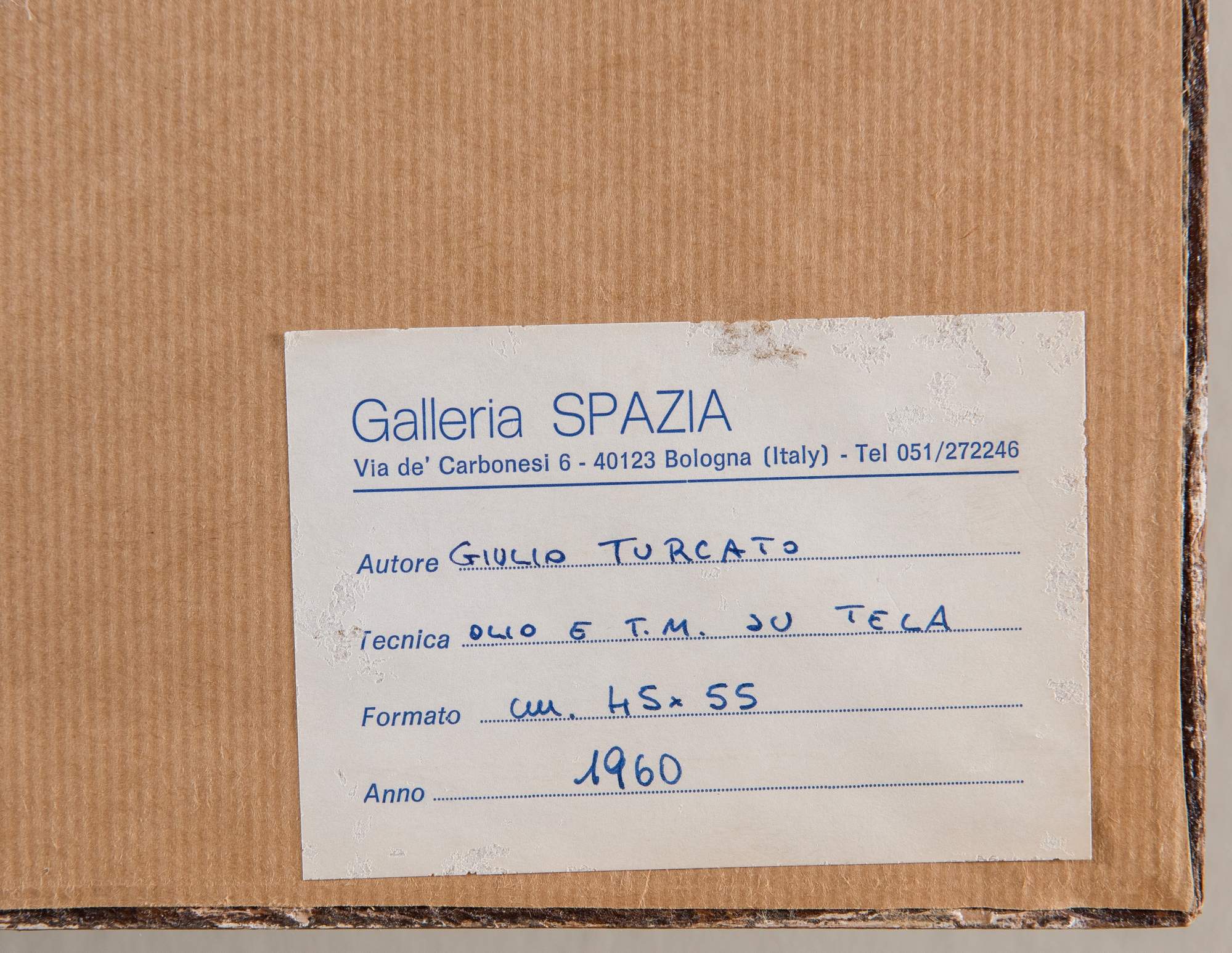 GIULIO TURCATO (Mantova 1912 - Roma 1995) "Composizione cangiante", 1960. Olio e tecnica mista su tela. Cm 45x55. Opera firmata e datata in basso a destra Turcato 60. Al retro reca numero di archivio E.45562138214. Al retro reca etichetta Galleria Spazia, Bologna. Opera archiviata nel Febbraio 1989.