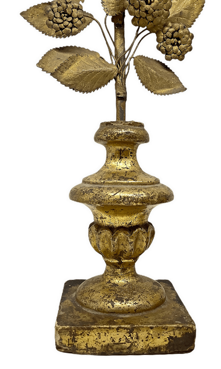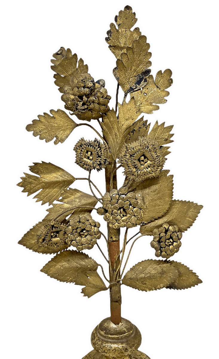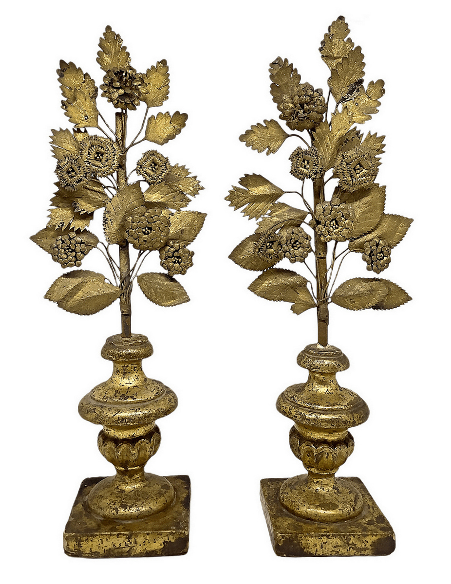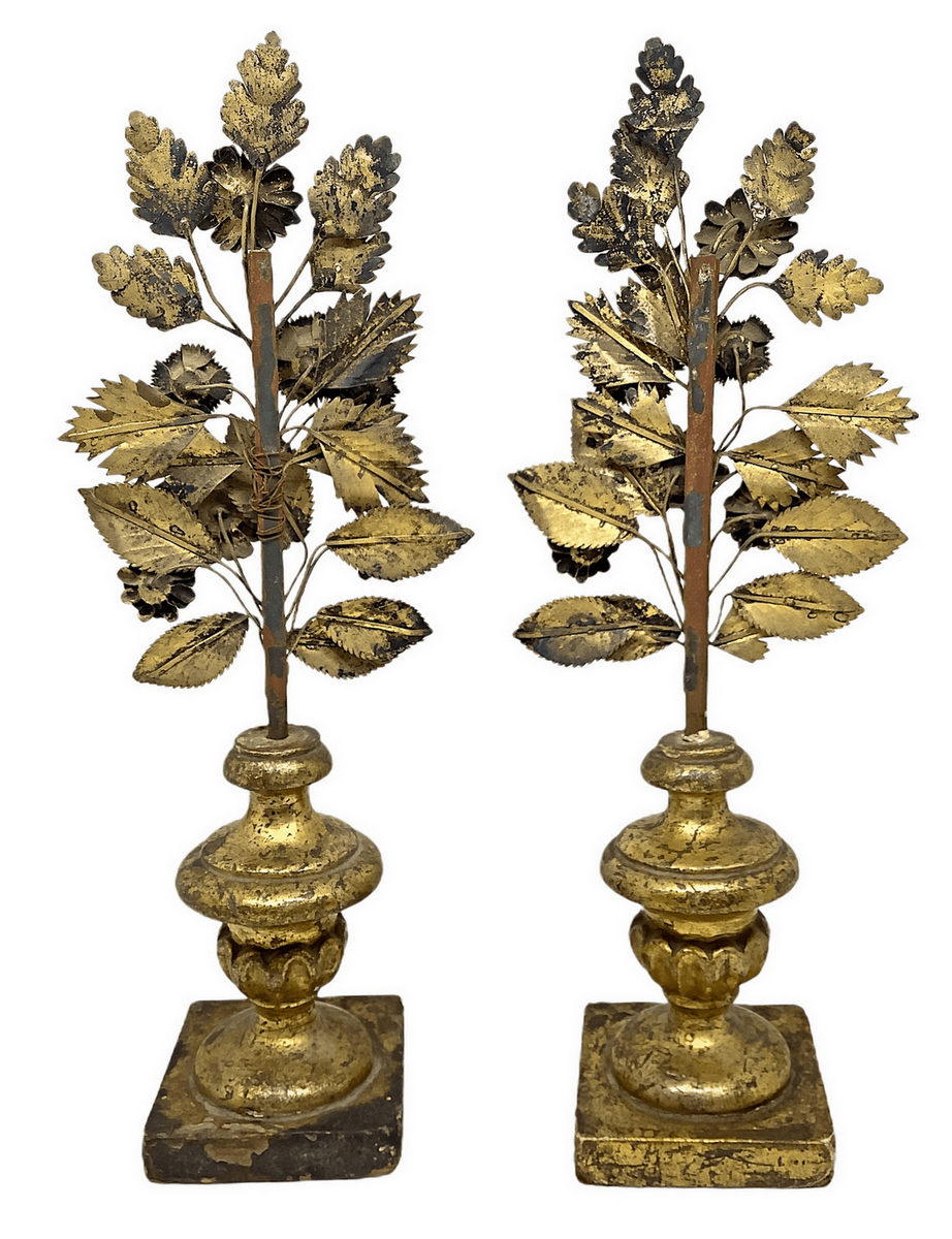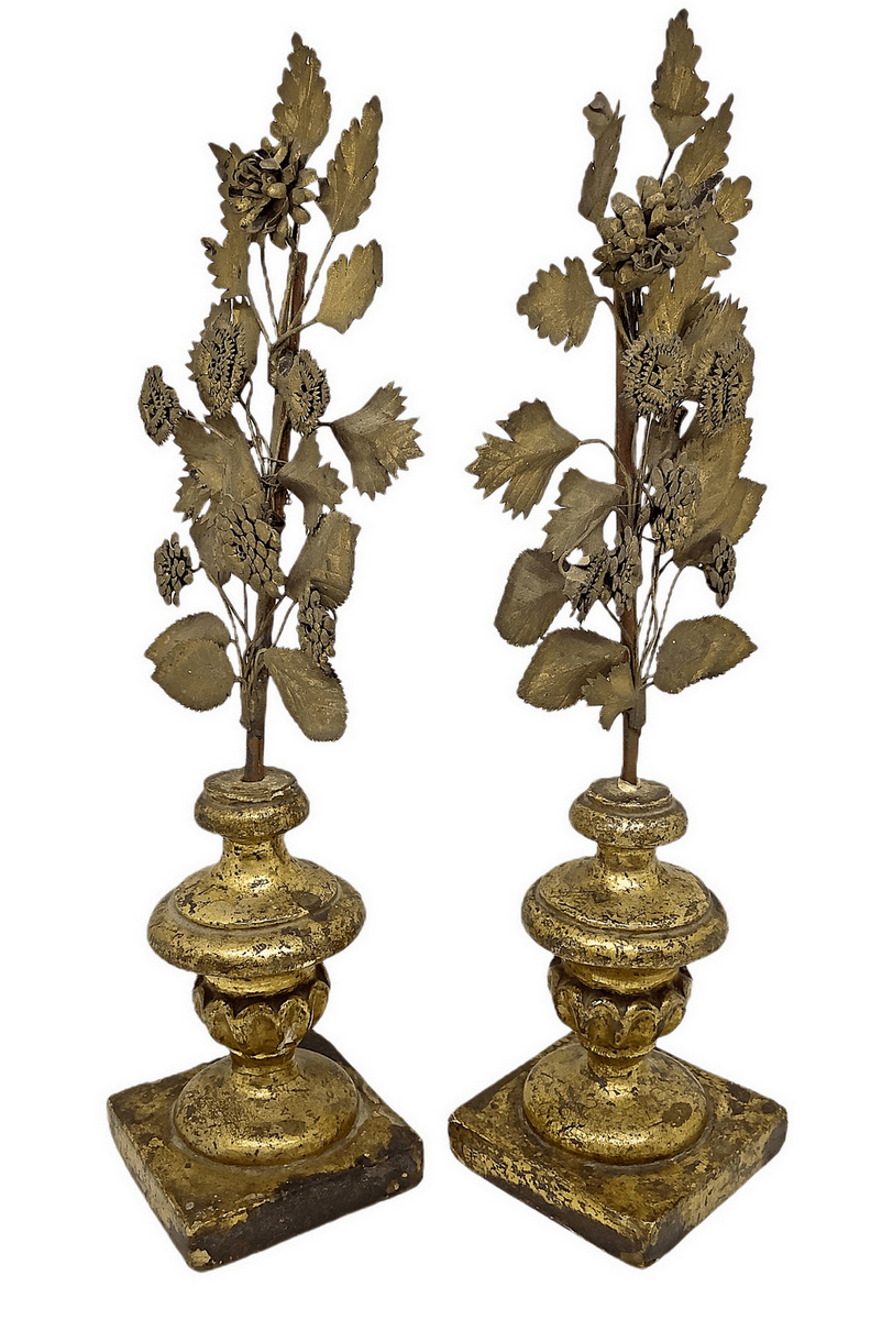 Coppia di palmette in ottone su basi lignee dorate a foglia. XIX secolo. H cm 31. Base cm 8x8