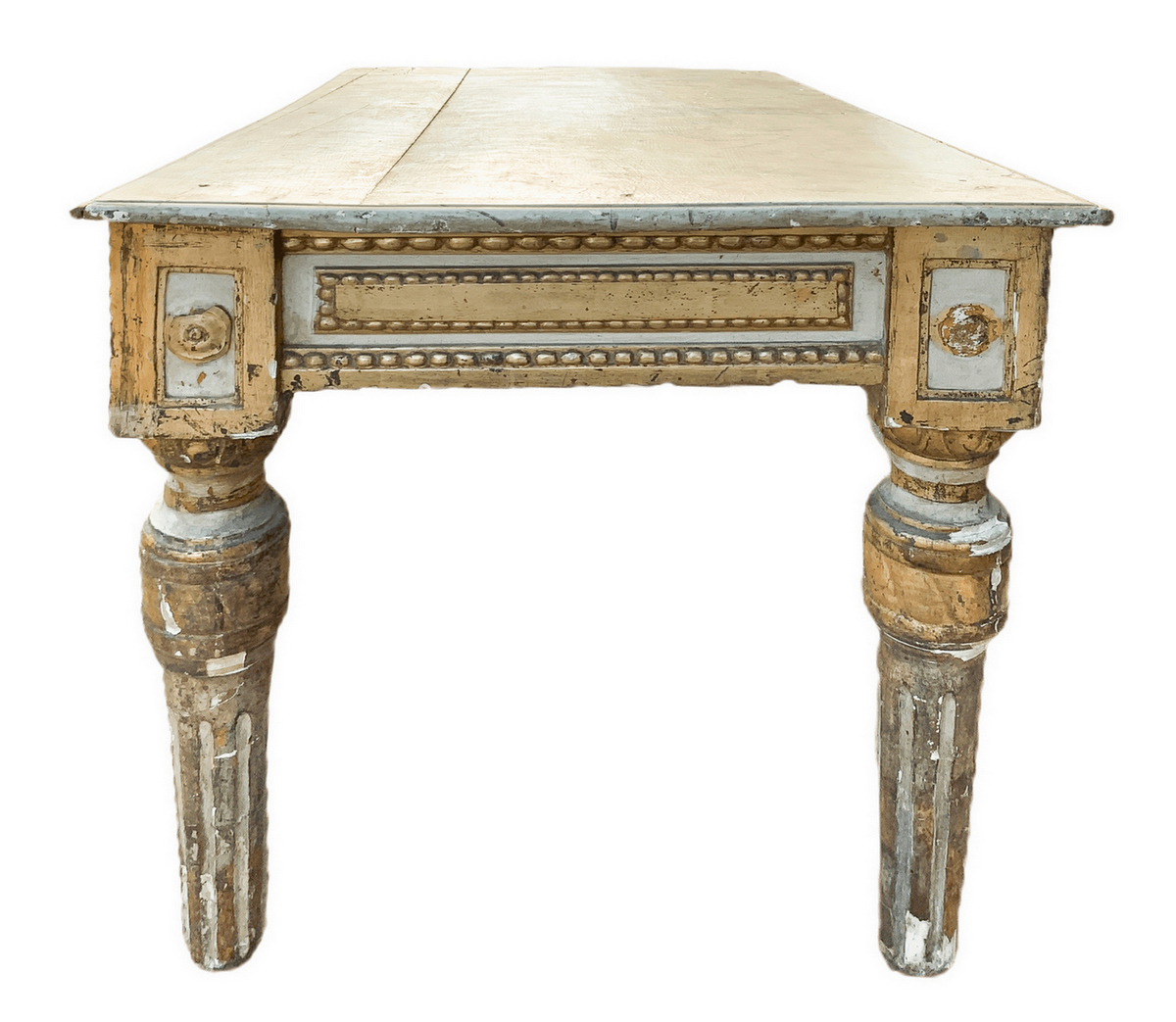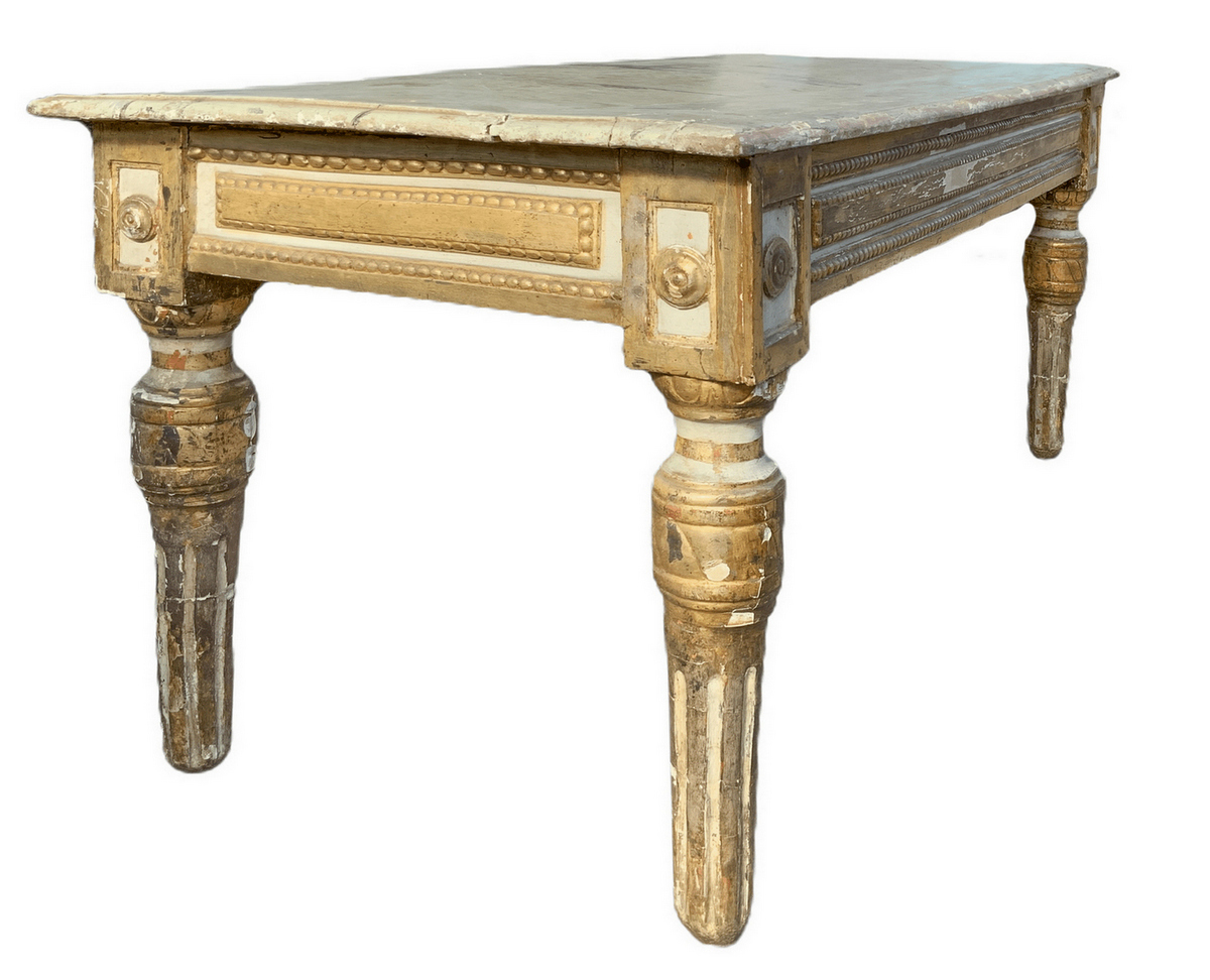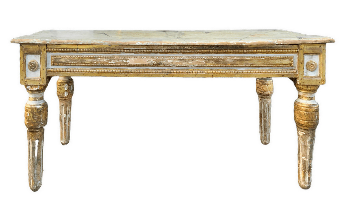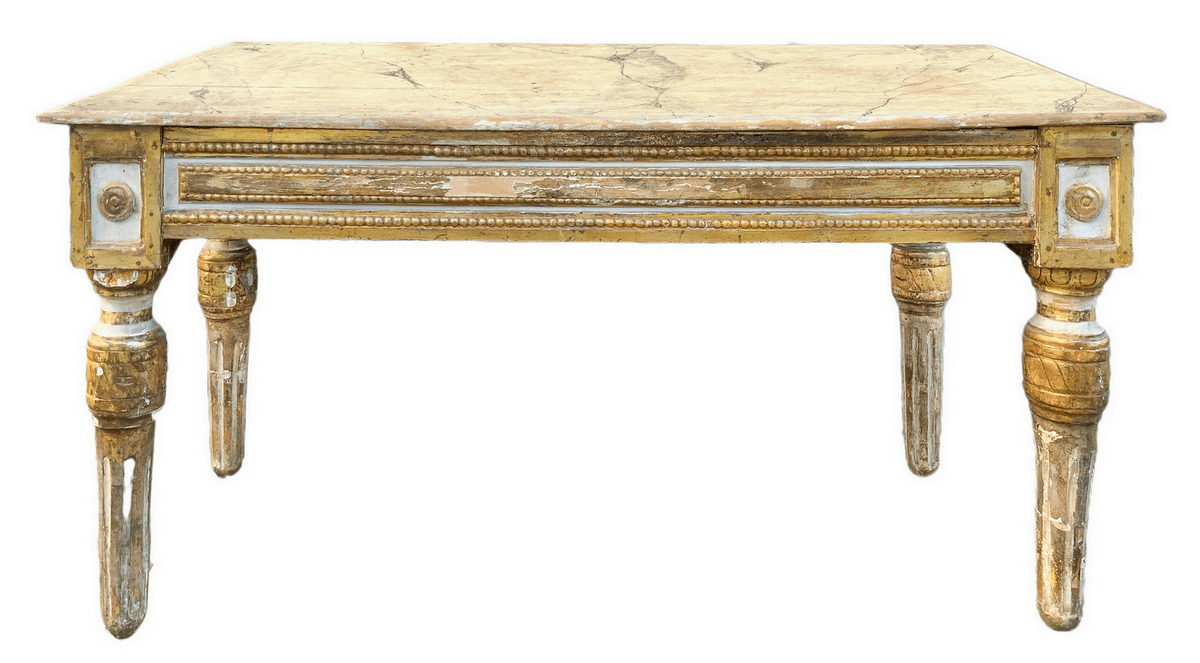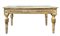 Tavolino basso in legno dorato e laccato, piano laccato in finto marmo, fine XIX secolo. H cm 50. Larghezza cm 126x58