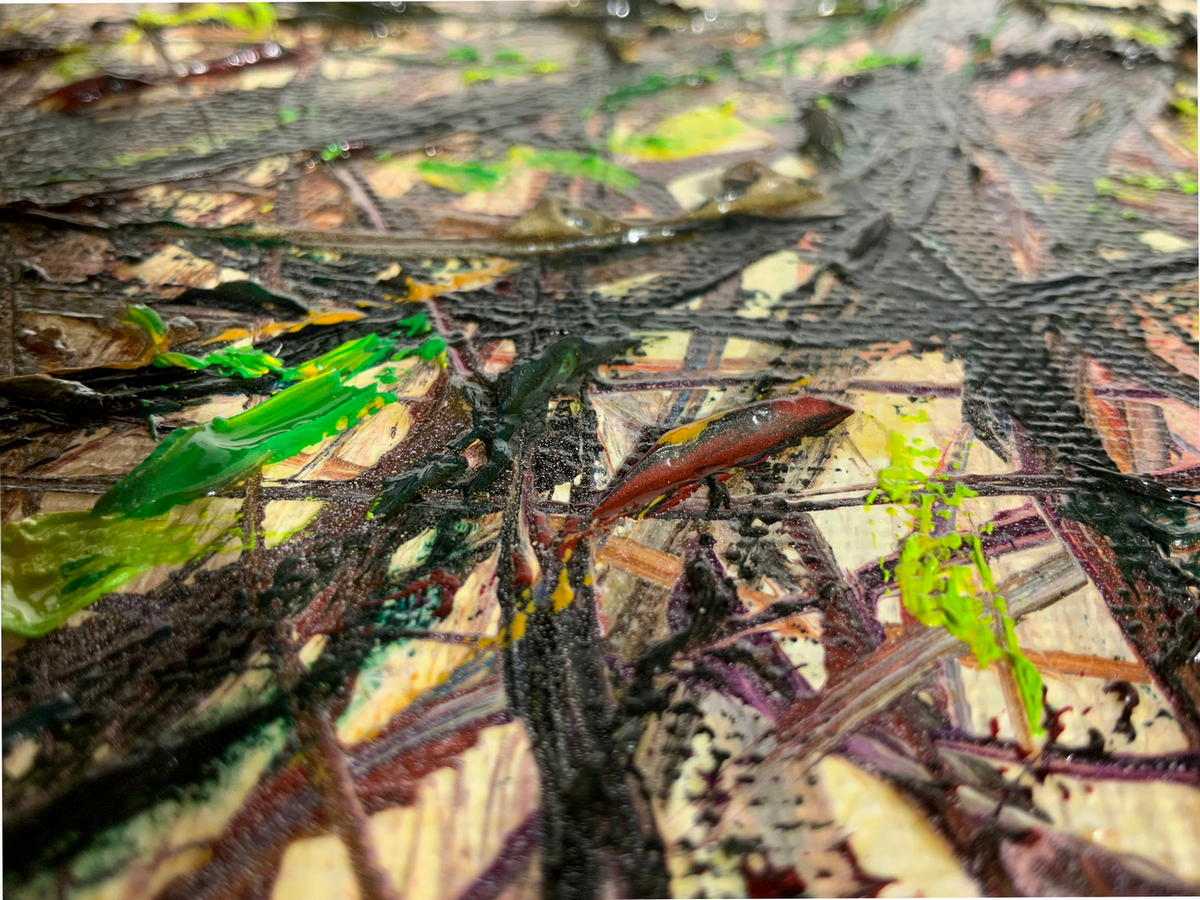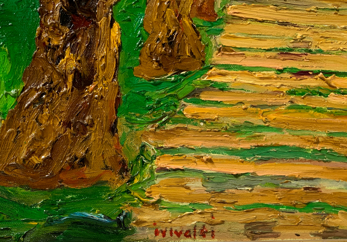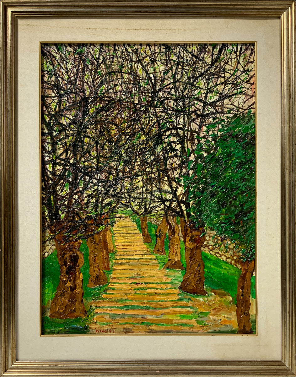 Dipinto ad olio su tela firmato Italo Vivaldi, raffigurante sentiero con alberi. Cm 82x70