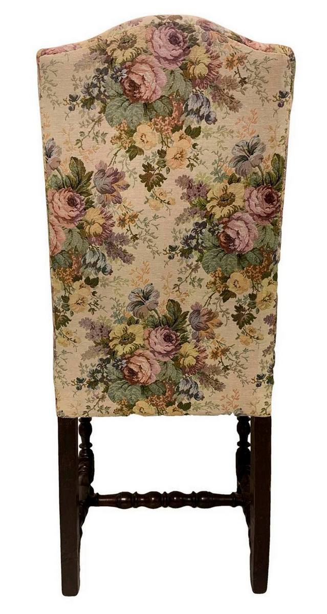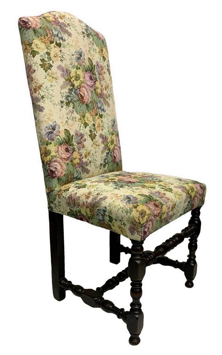 Coppia di seggioloni, Lombardia, Italia, XVIII secolo. Schienale alto mosso nella sommità . Gambe tornite a rocchetto con piede a cipolla, collegate ad H da un traversa tornita. Seduta e spalliera imbottita con tappezzeria floreale in ottime condizioni. H