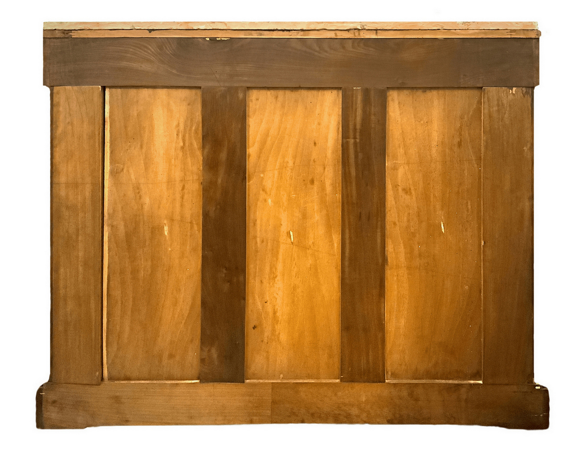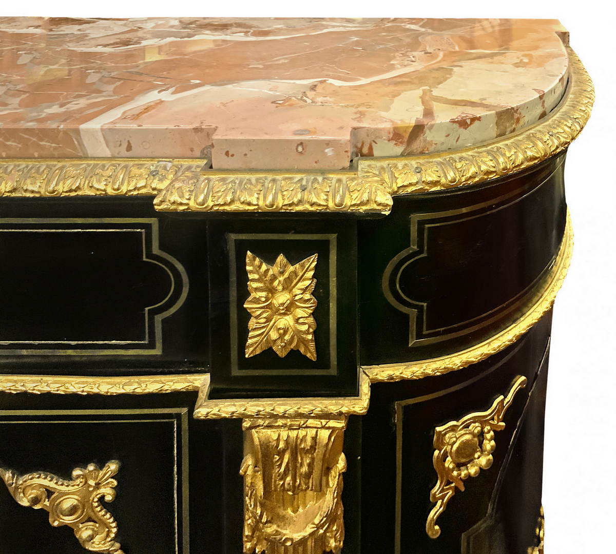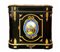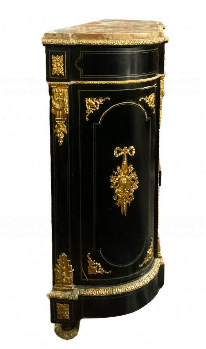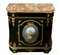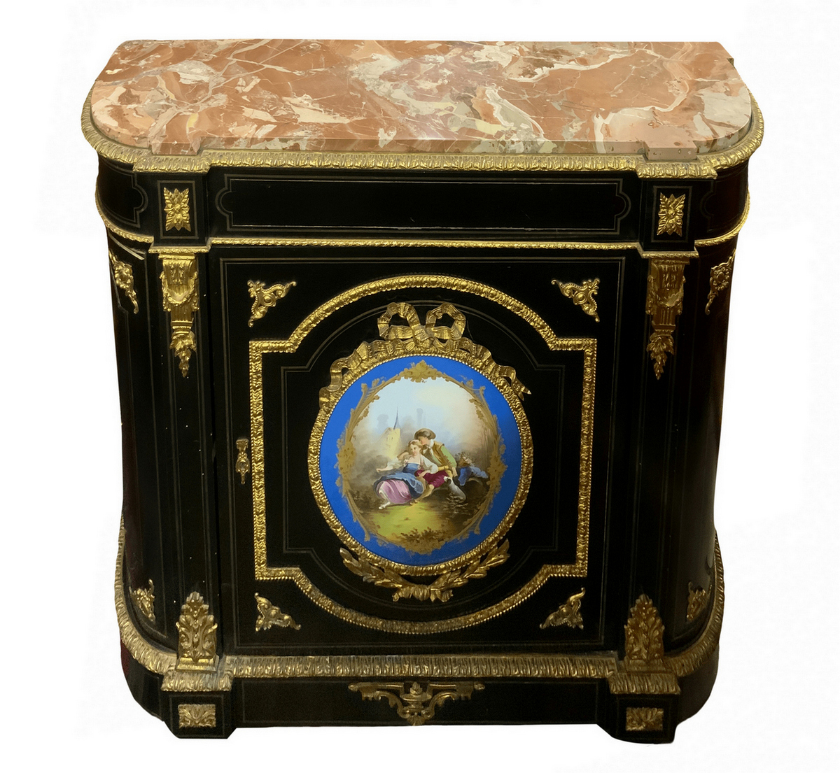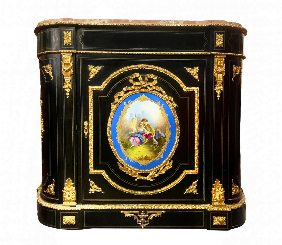 Servante-credenza in legno nero ebanizzato mossa sui lati con sportello centrale recante grande placca di ceramica blu nello stile di Sevres. Ricche applicazioni in bronzo cesellato e dorato. Marmo al piano. Stile Napoleone III. XIX/XX secolo. Cm 115x125x