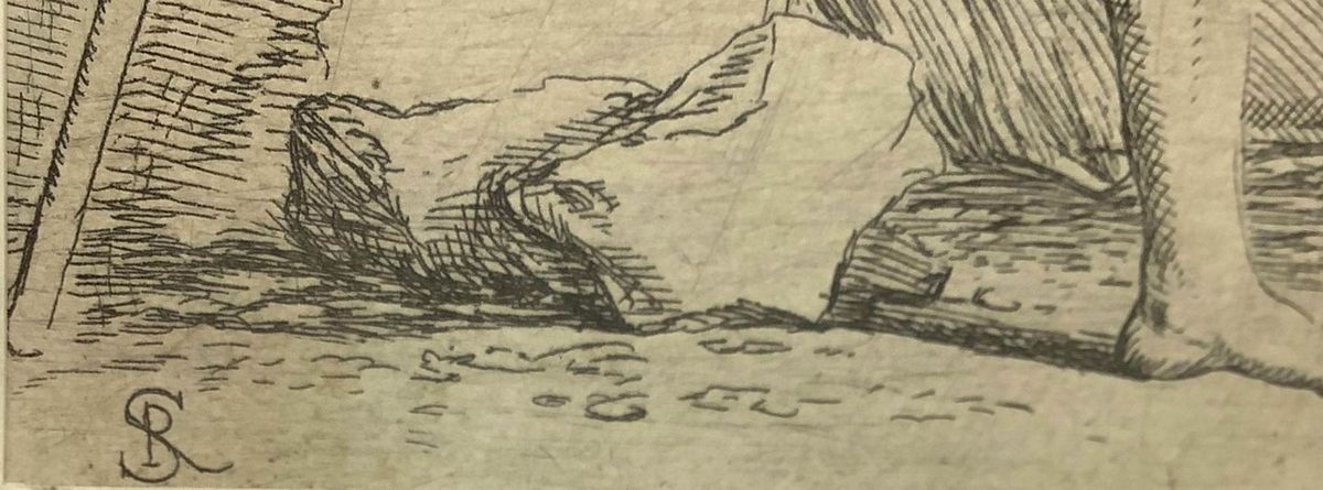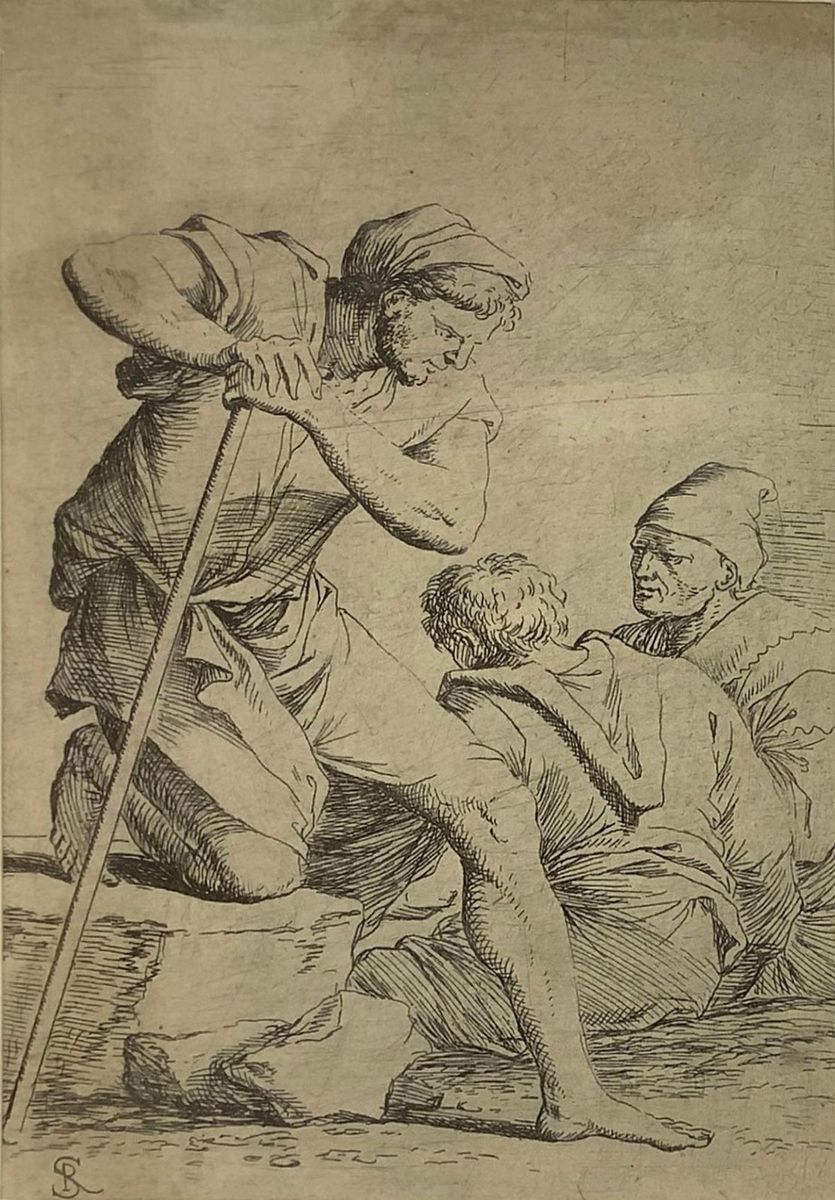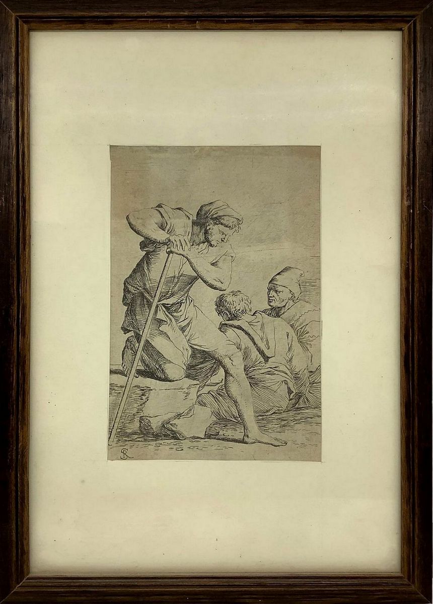 Salvator Rosa, incisione ad acquaforte a punta secca, raffigurante uomo con bastone e due personaggi seduti di cui uno di spalle. Monogramma a sinistra. Tratto da "Diverse figure ".