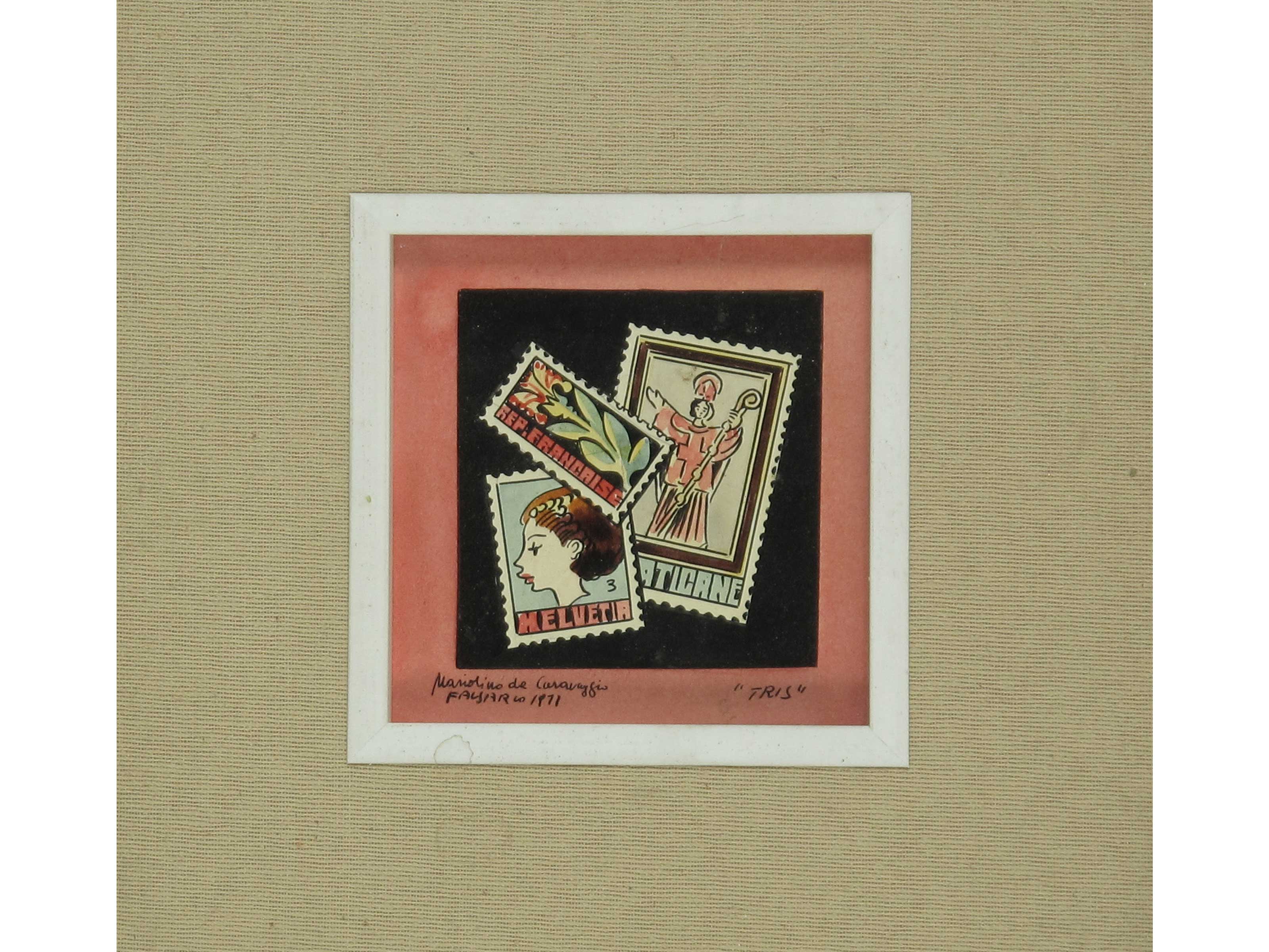 Mariolino da Caravaggio (1924-1992) Francobolli Tecnica mista Firmato Datato 1977 Misure 12x12 cm