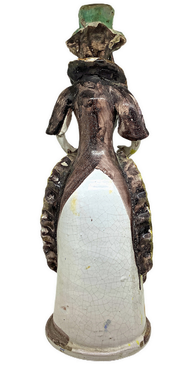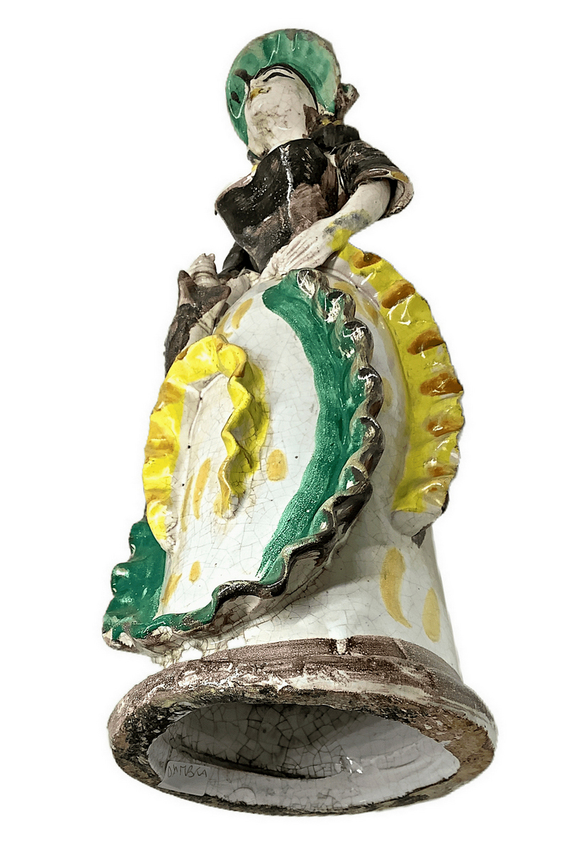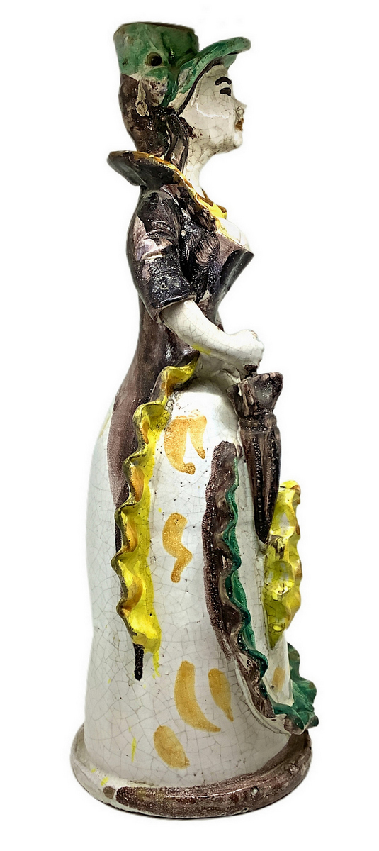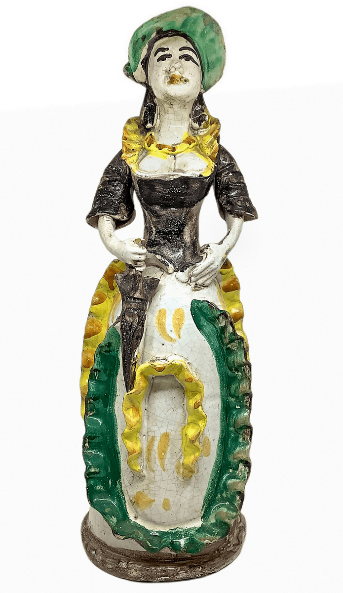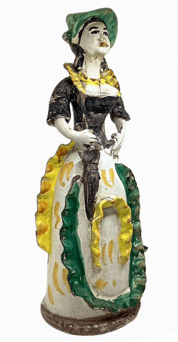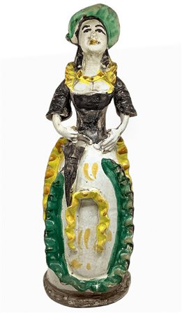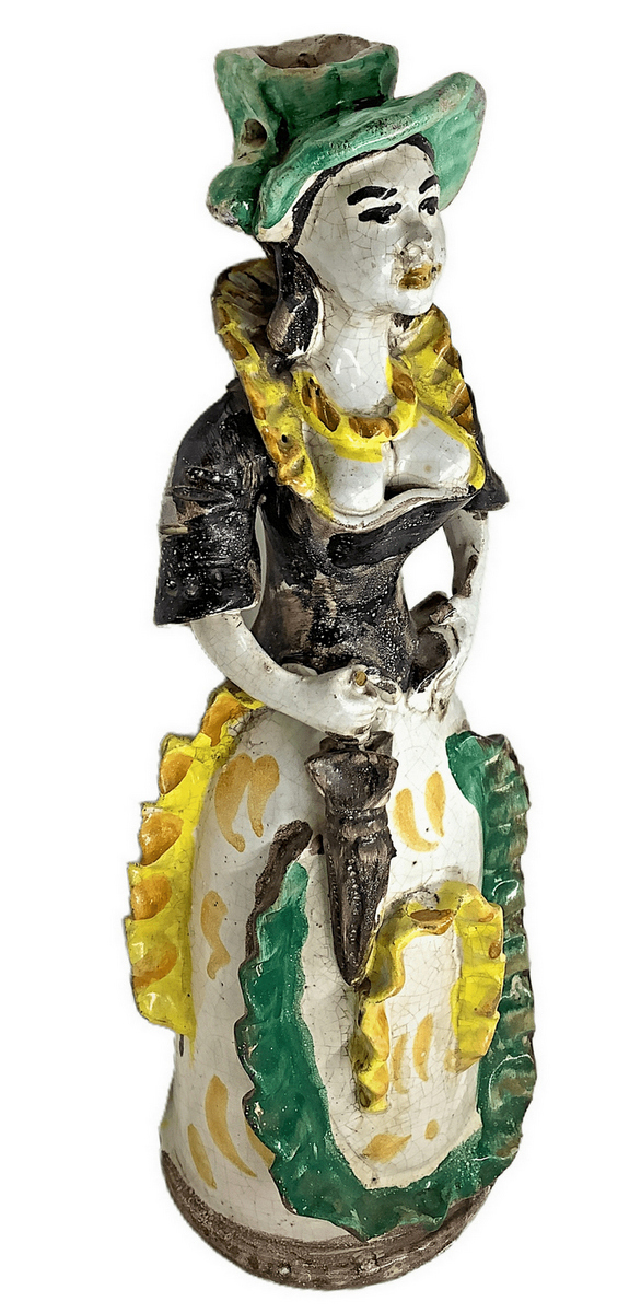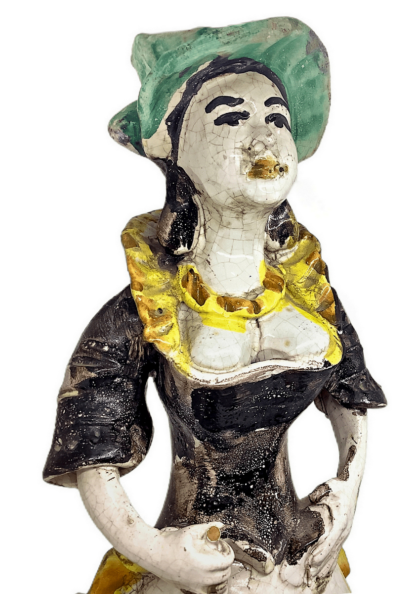 Lumiera in maiolica di Caltagirone raffigurante donna. H cm 42. Piccola mancanza