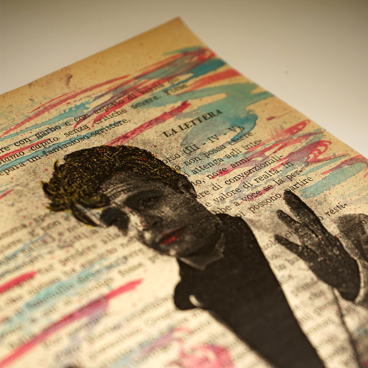 Stampa e pittura ad acquerello su pagina vintage con una lacca opaca come finitura protettiva.