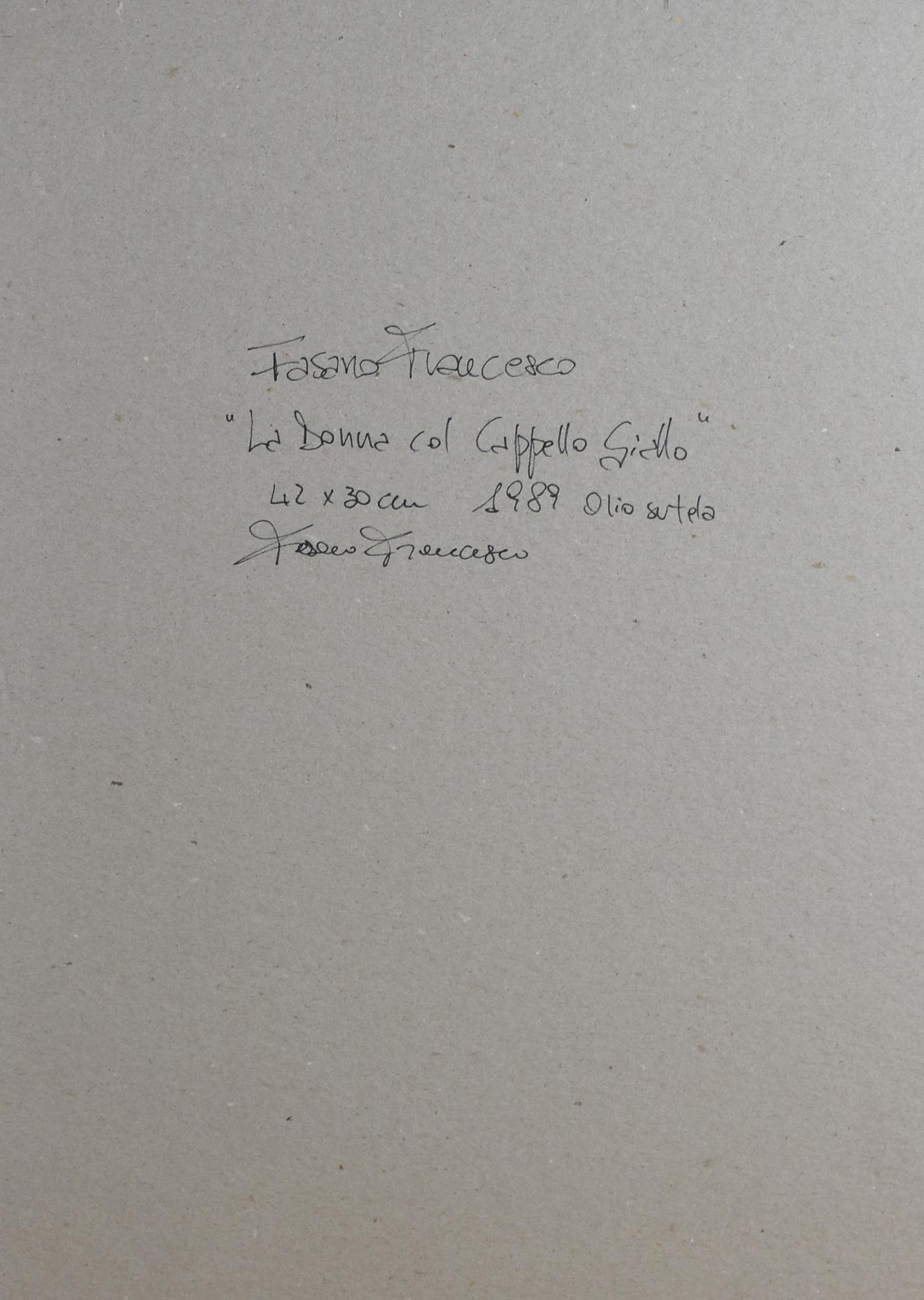 Francesco Fasano LA DONNA COL CAPPELLO GIALLO acrilico su cartone, cm 42x30...