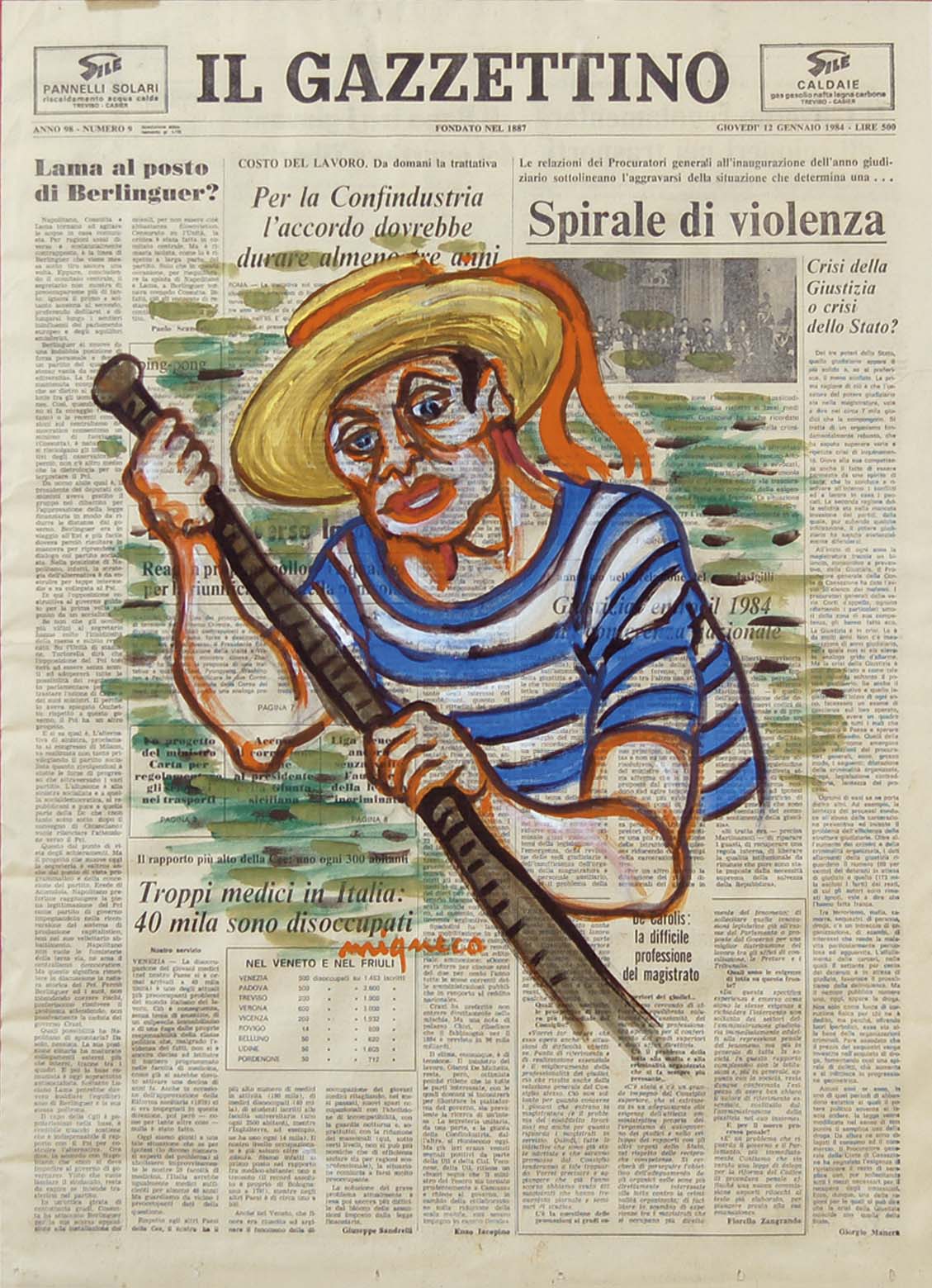 MIGNECO GIUSEPPE Messina 1908 - Milano 1997 Gondoliere tecnica mista su carta di giornale 60x43 cm firma in basso al centro provenienza già collezione prof. Mario Stefani Venezia