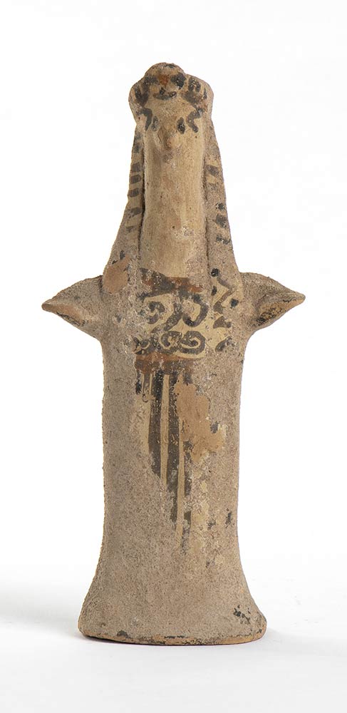 Regione della Beozia, VII - VI secolo a.C.; alt. cm 15; Statuina raffigurante una dea stilizzata. Sul capo, una corona dalla quale discendono lunghi capelli. Le tracce di policromia mostrano abiti riccamente adornati. Intatta.
