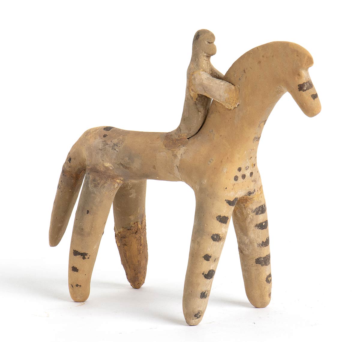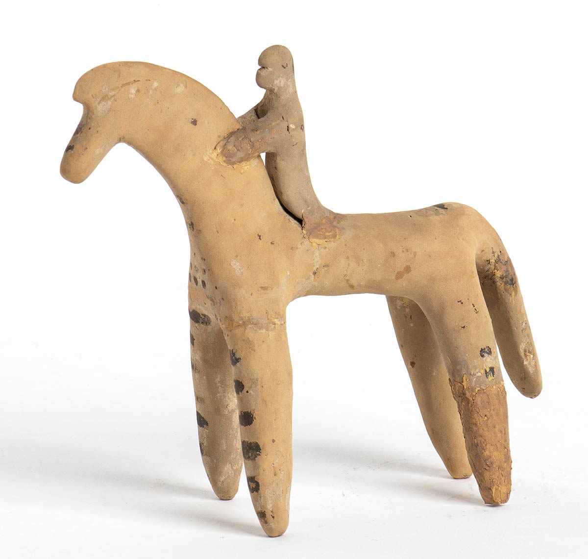 Regione della Beozia, VI - V secolo a.C.; alt. cm 12; lungh. cm 13; Bellissima statuina raffigurante un cavaliere stilizzato su cavallo. Si conservano tracce dell’originale policromia. Restauri sul corpo, sulla zampa posteriore dell’animale e sulle appendici della figura umana.