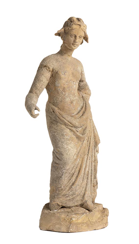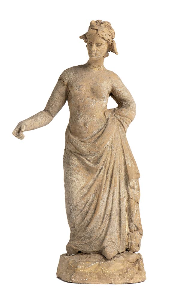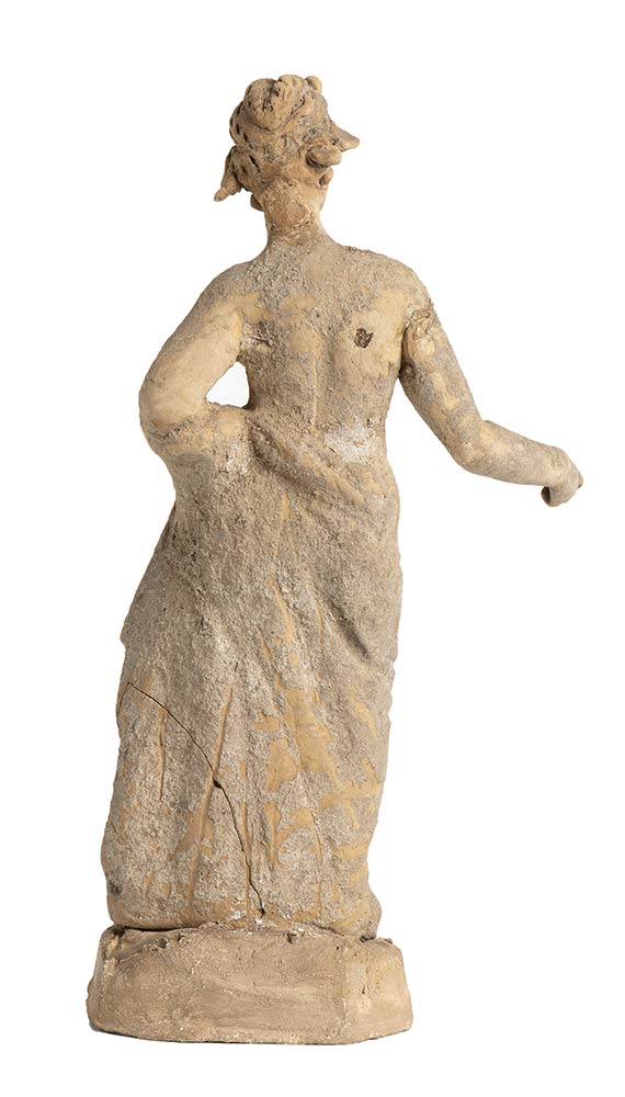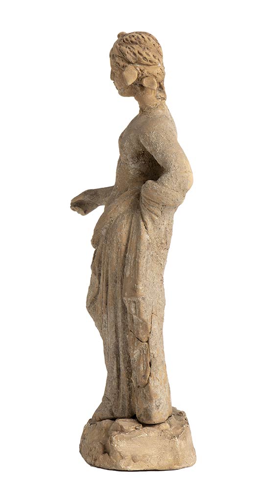 Magna Grecia o Sicilia, IV - III secolo a.C.; alt. totale cm 23 (con il basamento di cm 2); Splendida statuina in terracotta raffigurante una Venere stante su di un piccolo basamento moderno realizzato in pasta sintetica a base minerale. La figura è avvolta da un panno che dai fianchi ricade fino ai piedi. I capelli sono raccolti in una corona floreale. Il viso e la capigliatura sono resi con una grande attenzione al dettaglio. Si conservano tracce dell’originale scialbatura. Presenza di piccoli restauri sul braccio e sul panneggio.