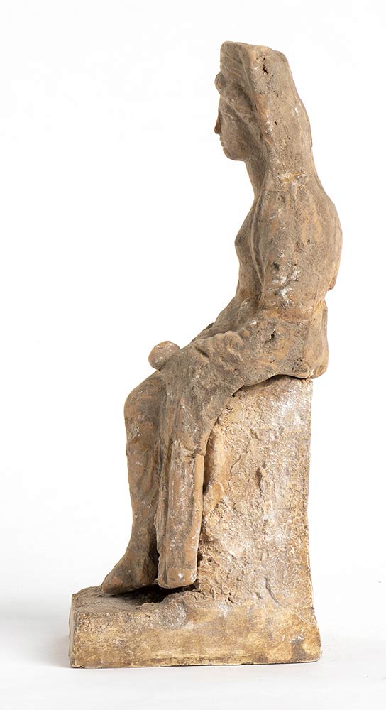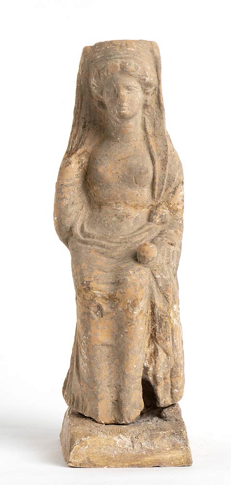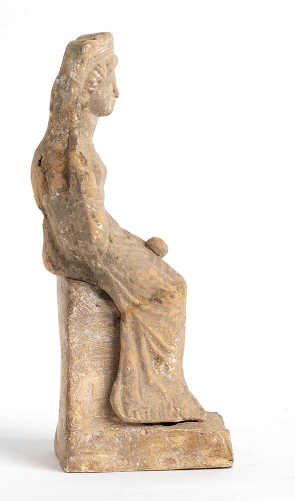 Magna Grecia o Sicilia, IV - III secolo a.C.; alt. cm 22 (con il basamento di cm 2); Elegante statuina in terracotta raffigurante una giovane dea (Demetra o Persefone) assisa in trono su di un basso basamento moderno realizzato in pasta sintetica a base minerale. La figura è adornata con orecchini e ha i capelli raccolti al di sotto del polos dal quale ricade un velo che le incornicia il volto. Il kitone le avvolge le braccia e le gambe; nella mano sinistra un frutto, probabilmente una melagrana. Grande cura nei dettagli del viso e del panneggio. Restaurata.