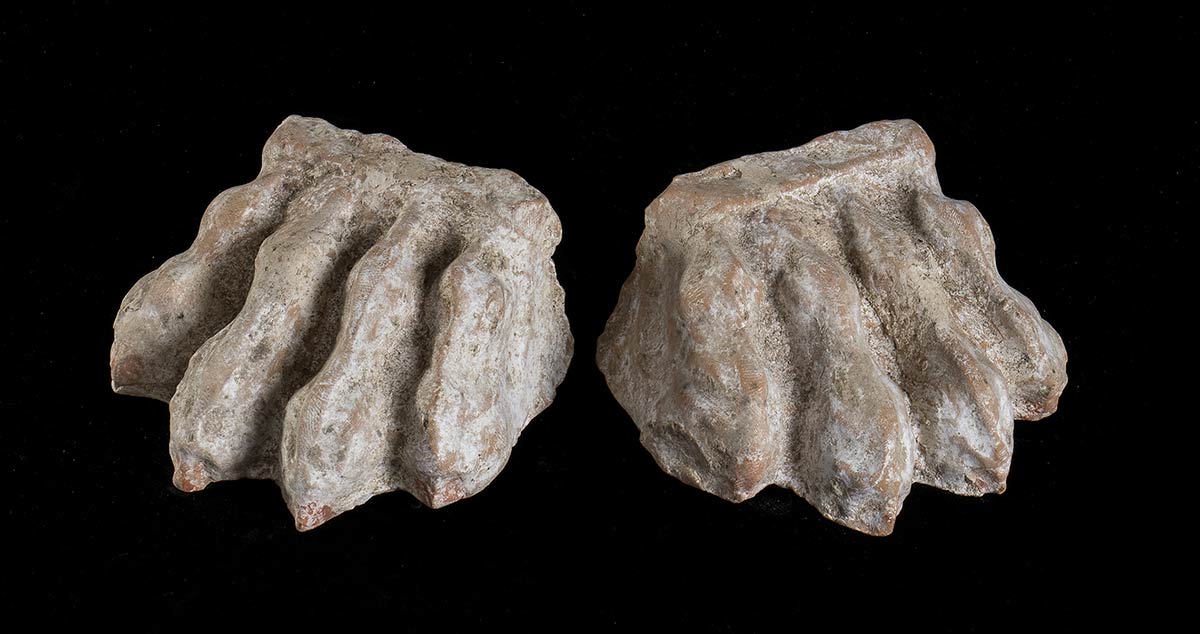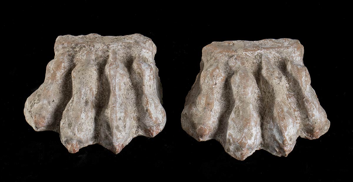 III secolo a.C.; largh. l’una cm 11; alt. l’uno cm 5,5; Rara coppia di sostegni in terracotta nella forma di zampe leonine. Integre, con tracce dell’originaria policromia.