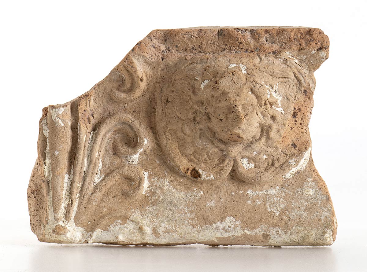 I secolo a.C. - I secolo d.C.; alt. cm 13,5; lungh. cm 19; Porzione di lastra di terracotta di rivestimento del tipo ‘Campana’, sulla quale si conserva parte di palmetta ed egida in squame di serpente al centro della quale spicca la testa di Medusa.