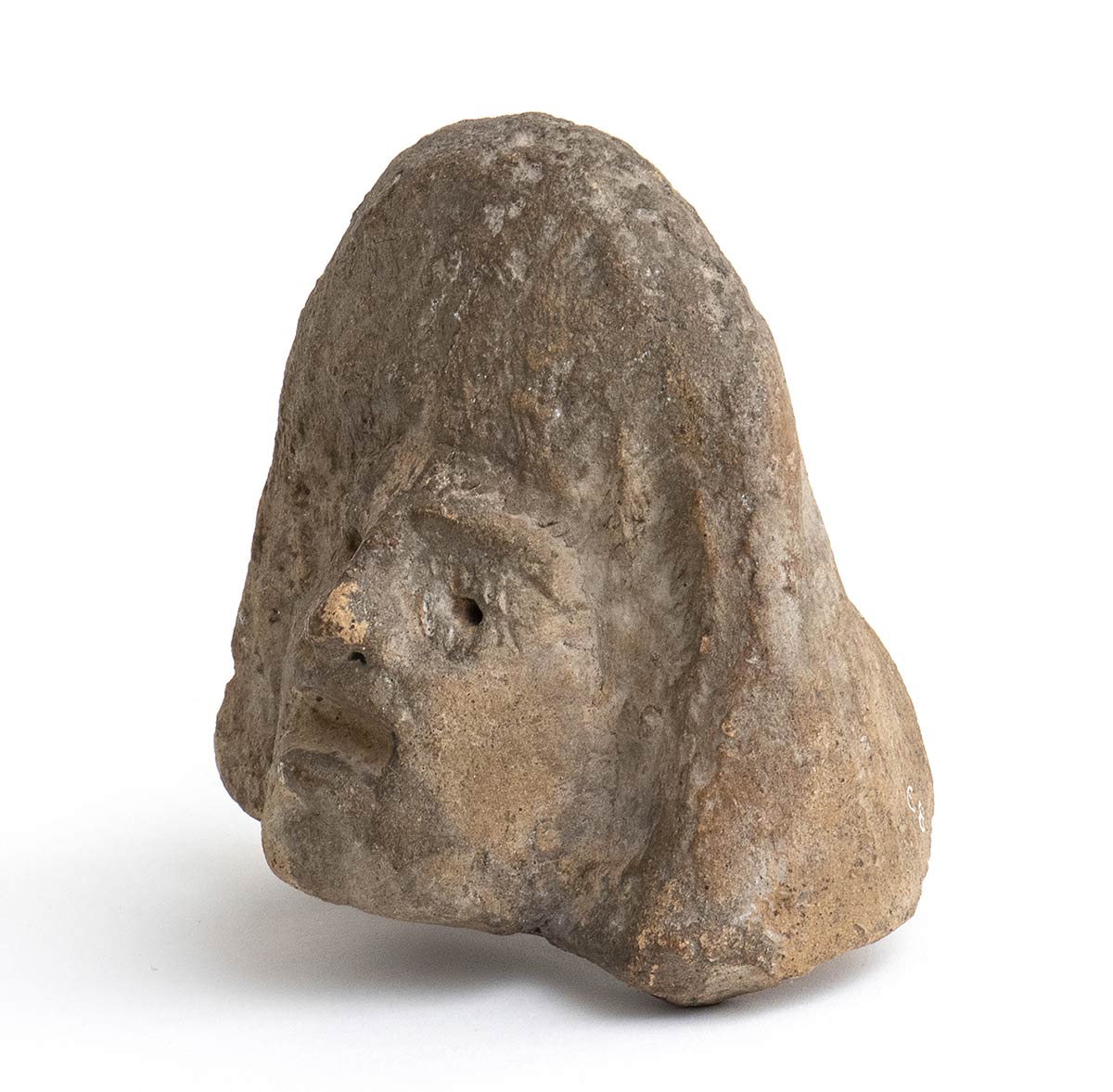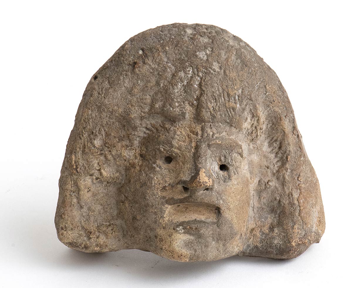 I secolo a.C. - I secolo d.C.; alt. cm 11; lungh. cm 12; spessore cm 8; Piccola antefissa in forma di maschera teatrale.
