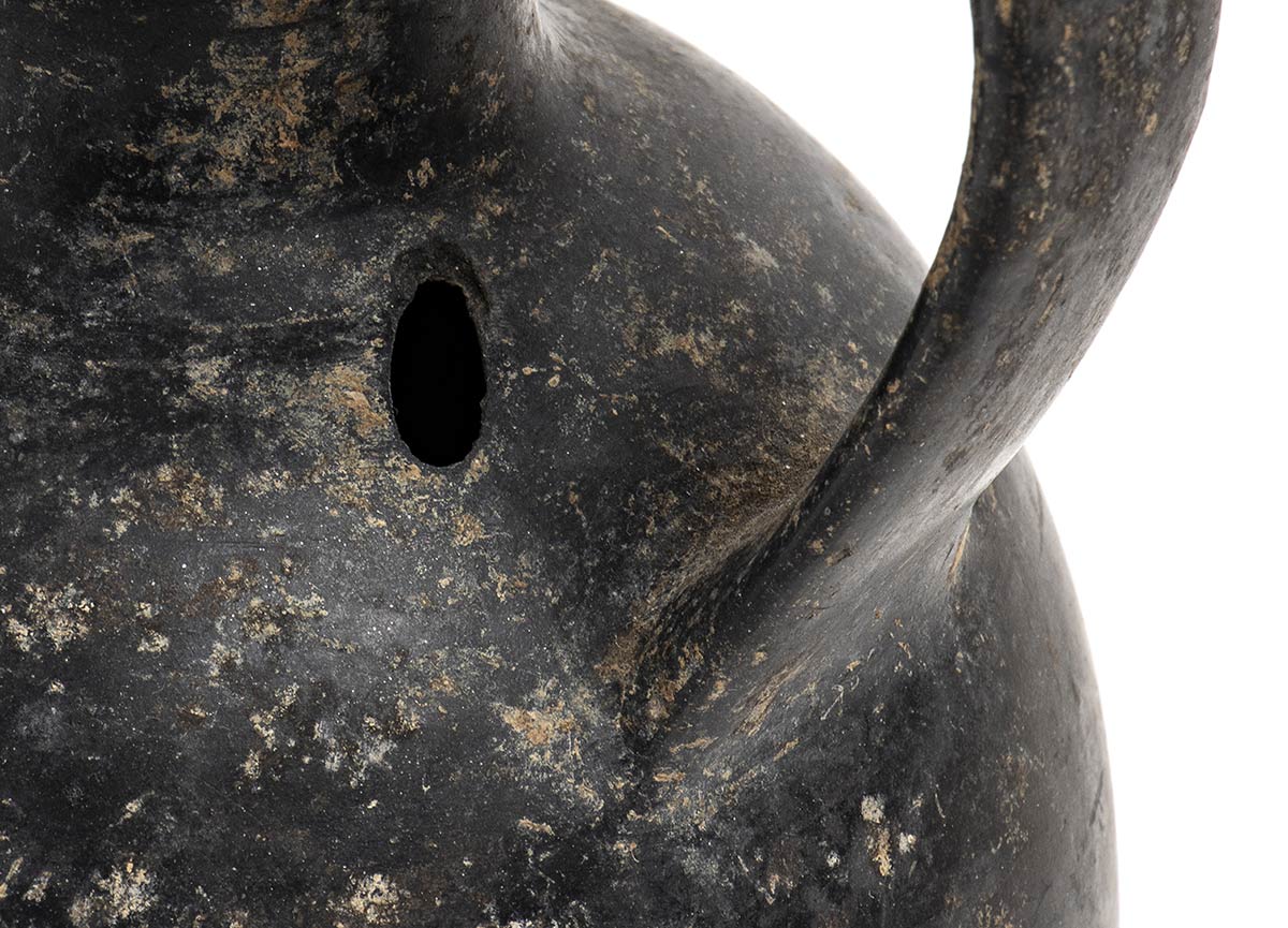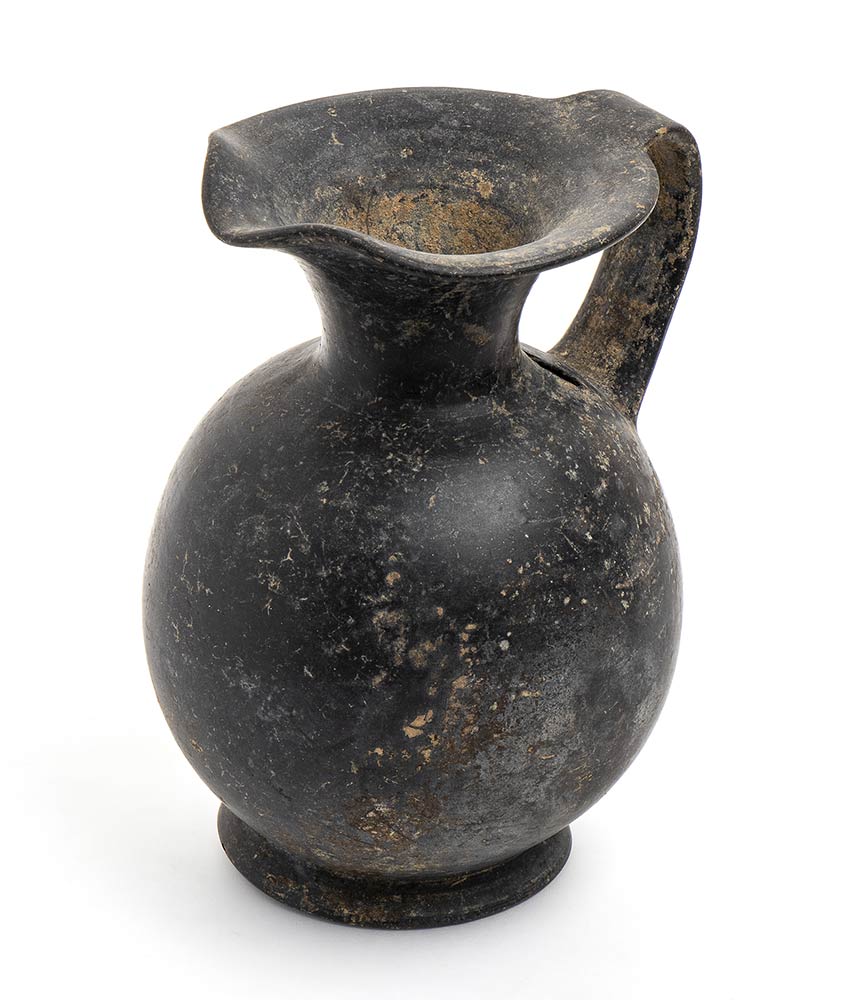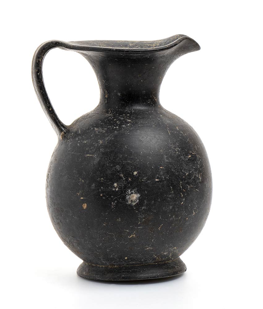Fine del VII - inizi del VI secolo a.C.; alt. cm 19,2; Bucchero nero lucidato a stecca. Integra, a parte un piccolo foro sotto l’ansa.