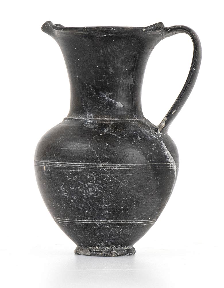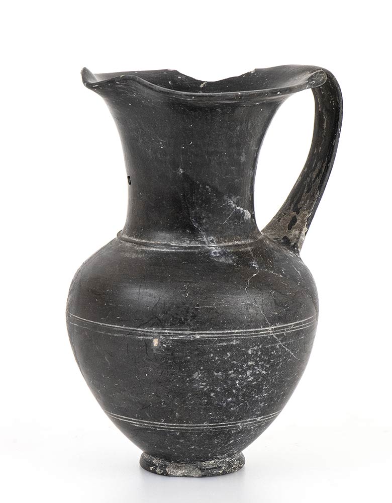 Fine del VII - inizi del VI secolo a.C.; alt. cm 20,7; Bucchero nero lucidato a stecca. Sbeccatura sul labbro e concrezioni calcaree sparse.