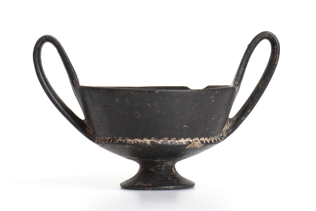 Fine del VII - inizi del VI secolo a.C.; alt. cm 11,5; diam. cm 12,5; Intatto, solo una sbeccatura sul labbro.