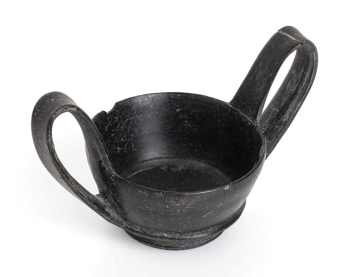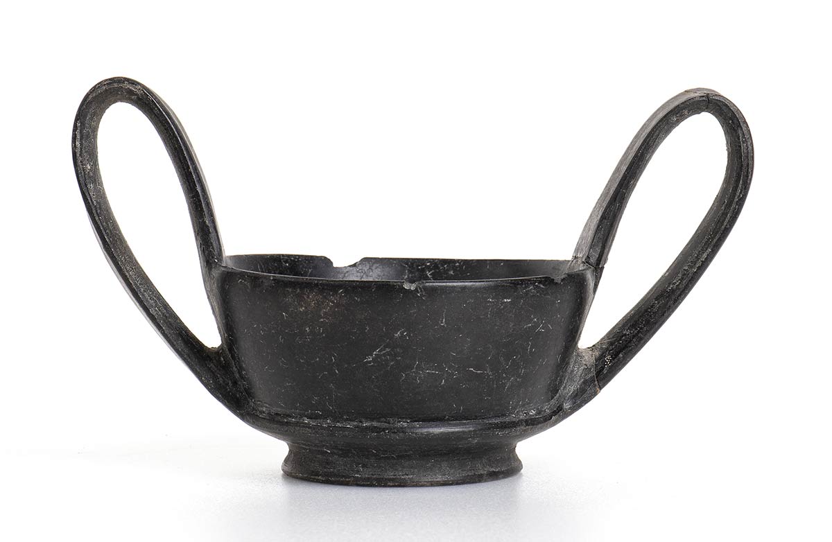 Fine del VII - inizi del VI secolo a.C.; alt. cm 9,4; diam. cm 9,5; Un’ansa reincollata, sbeccatura sul labbro.